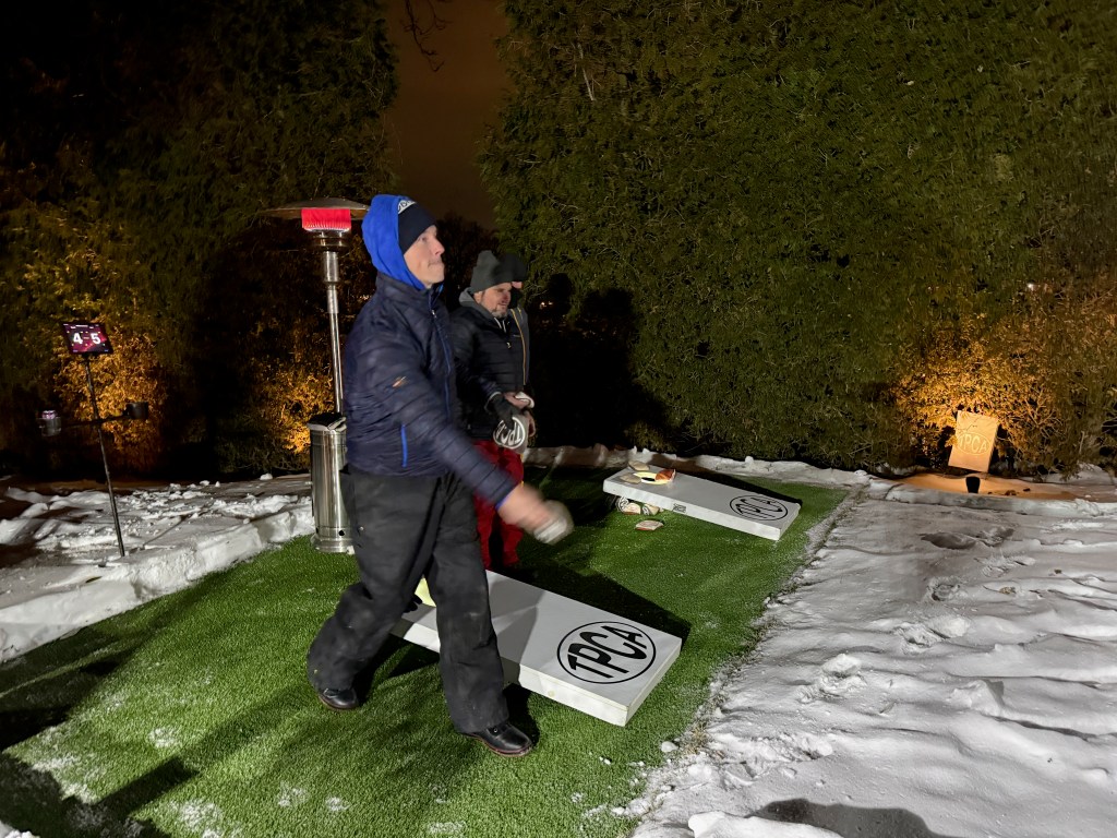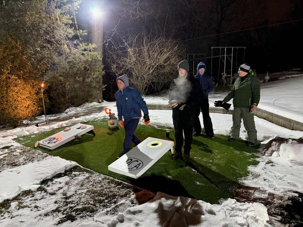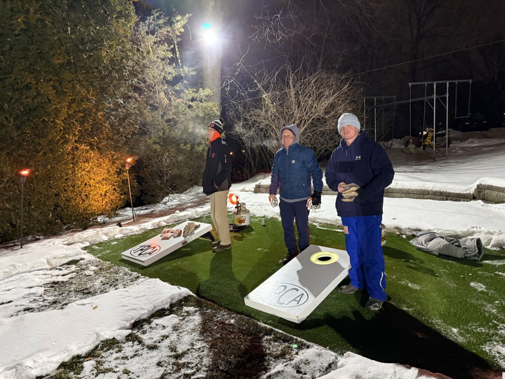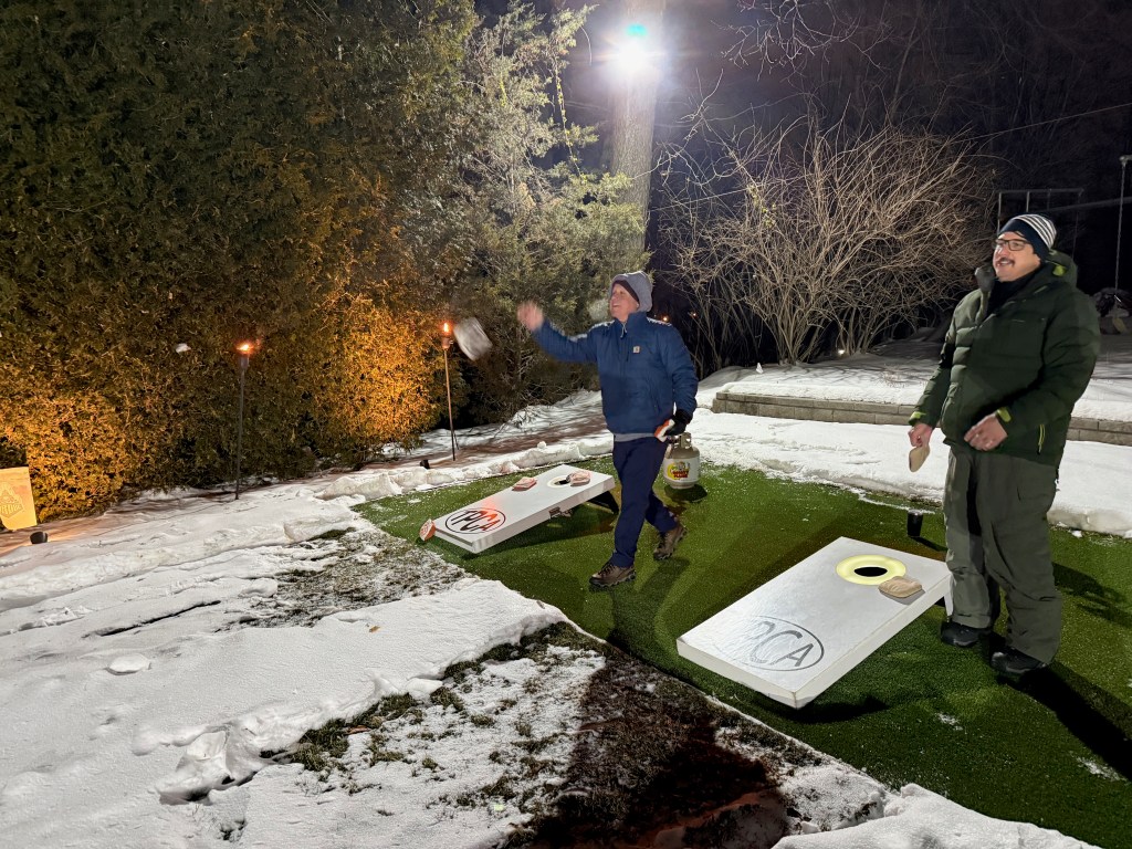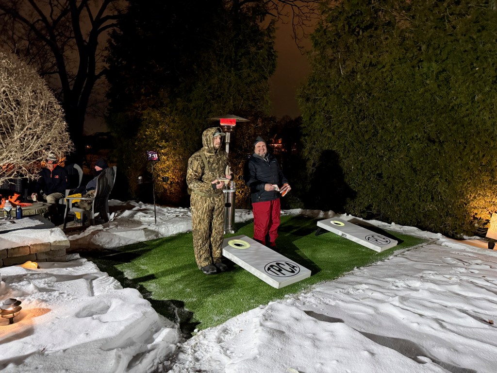 12/18/2025 – We had our annual Christmas Beer Exchange and Cornhole Spectacular tournament at John’s building in Wilder. We had lots of appetizers and beer! There were nine teams in our usual blind draw, double-elimination tournament. The dream team of Muff and George won, but it wasn’t easy; a couple of the games were way too close. Muff’s new haircut must have helped him play so well. It was nice to see the occasional players there. The prizes were General Thomas Bourbon with a special Christmas message. Fun times for all! Merry Christmas.