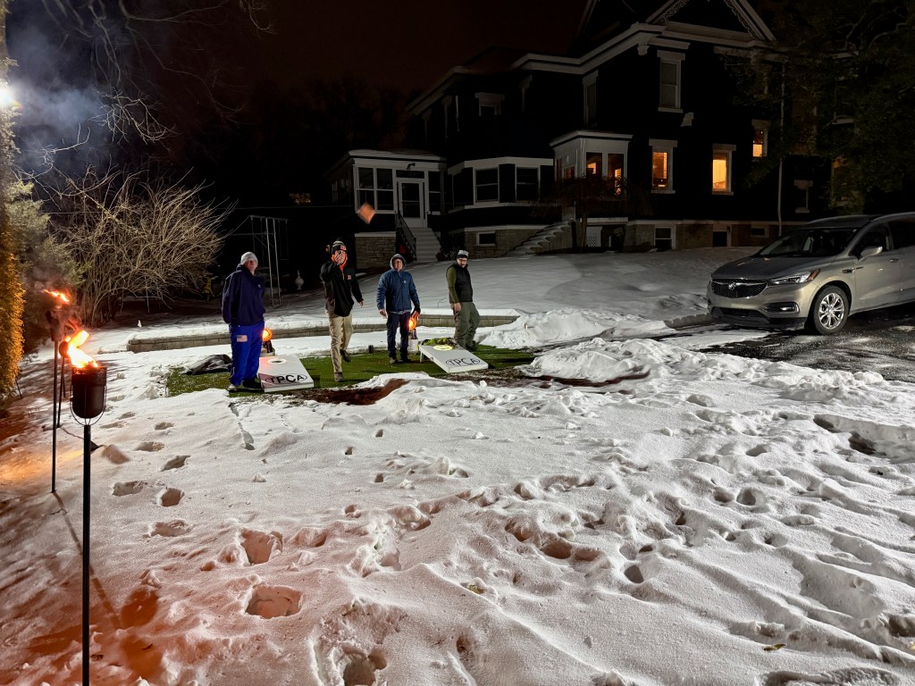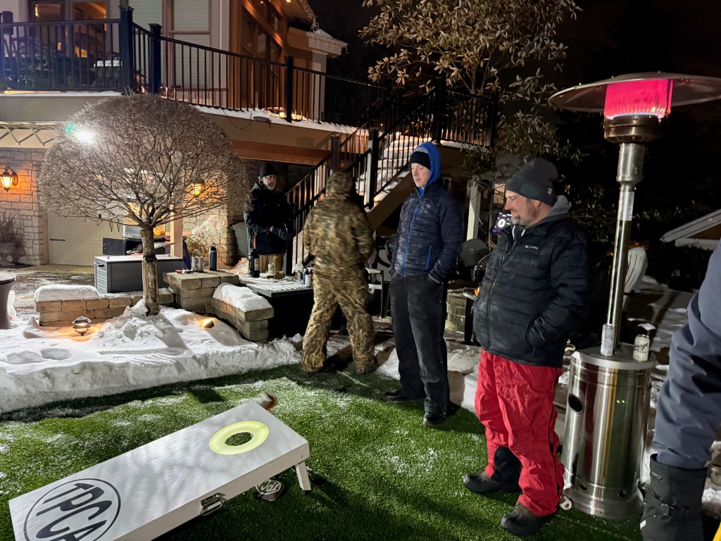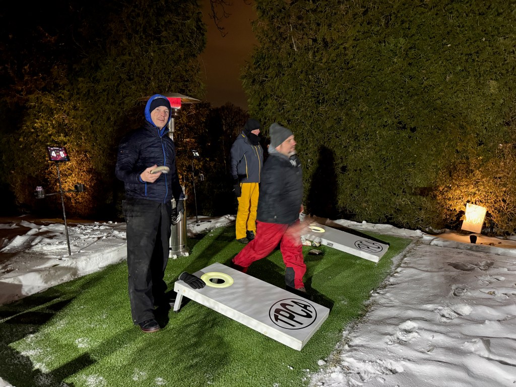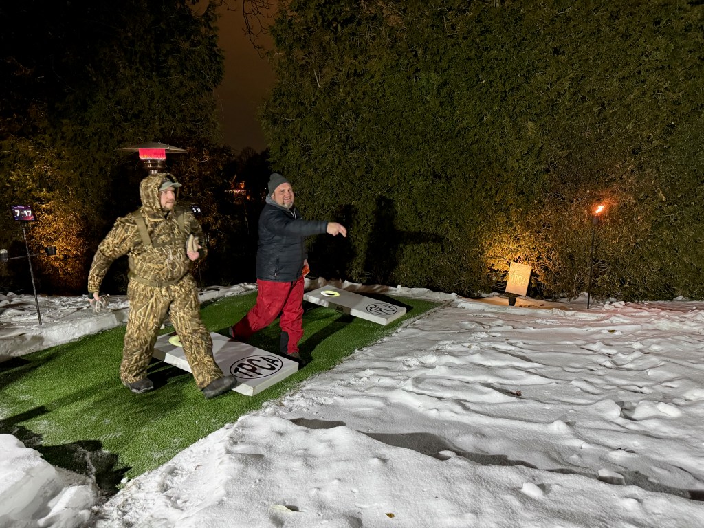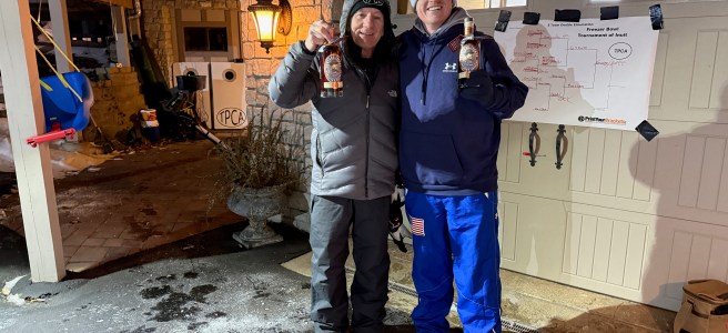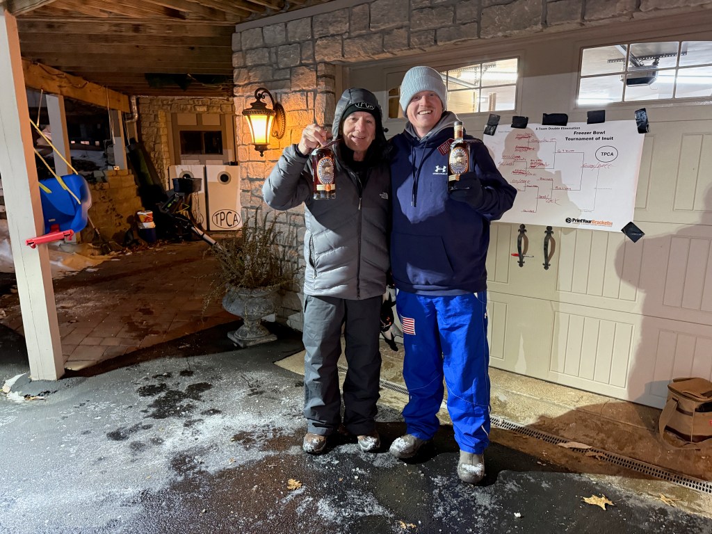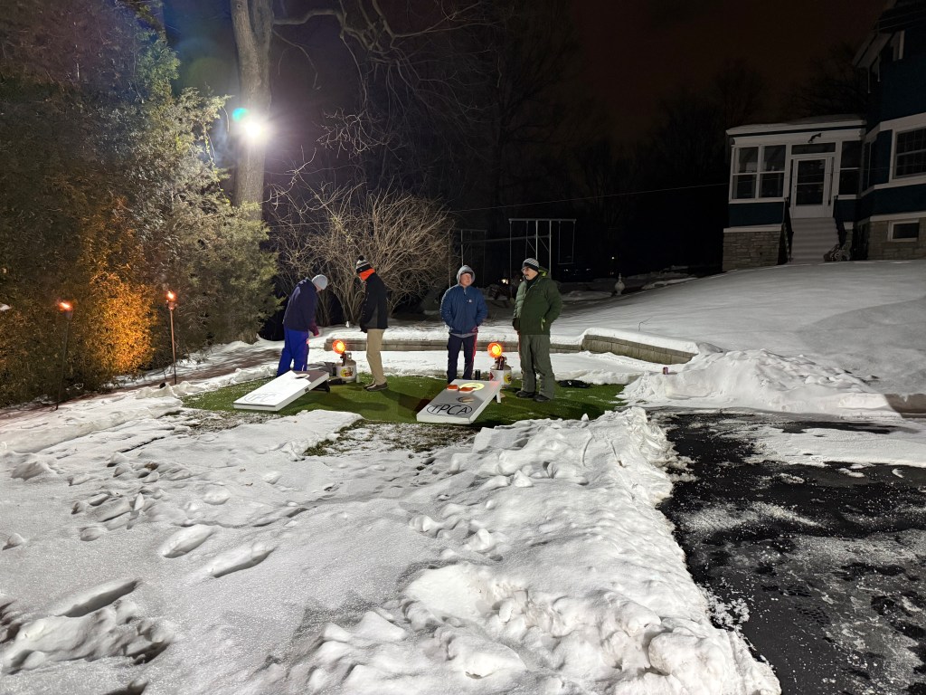 12/18/2025 – We had our annual Christmas Beer Exchange and Cornhole Spectacular tournament at John’s building in Wilder. We had lots of appetizers and beer! There were nine teams in our usual blind draw, double-elimination tournament. The dream team of Muff and George won, but it wasn’t easy; a couple of the games were way too close. Muff’s new haircut must have helped him play so well. It was nice to see the occasional players there. The prizes were General Thomas Bourbon with a special Christmas message. Fun times for all! Merry Christmas.