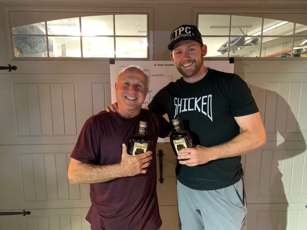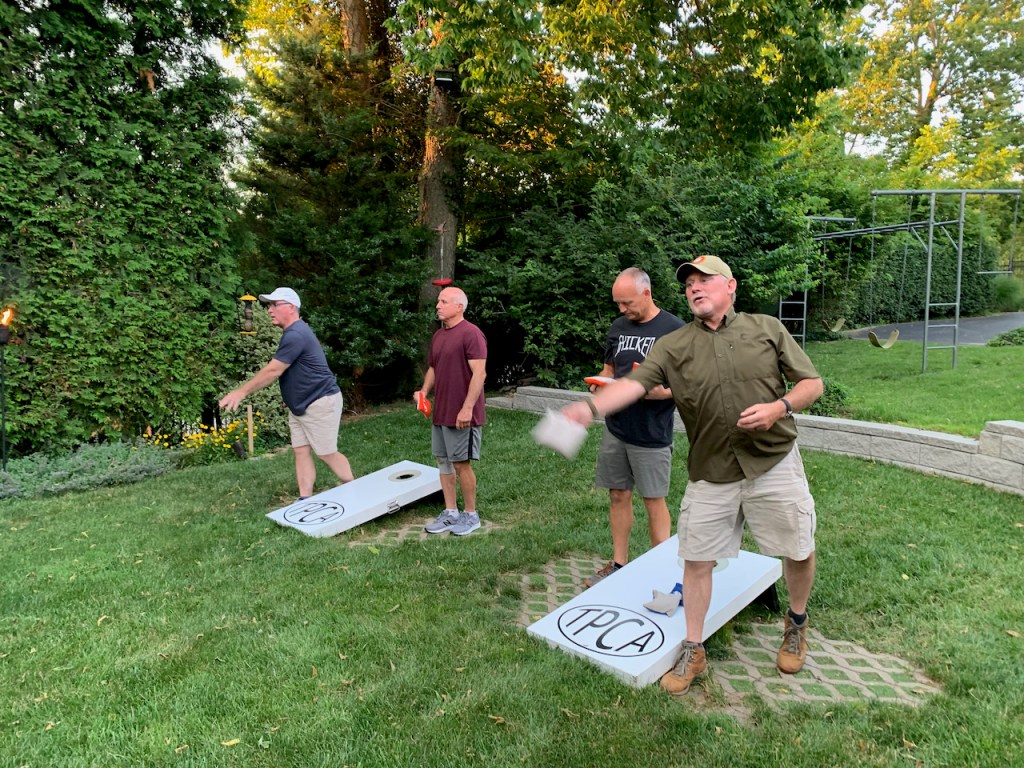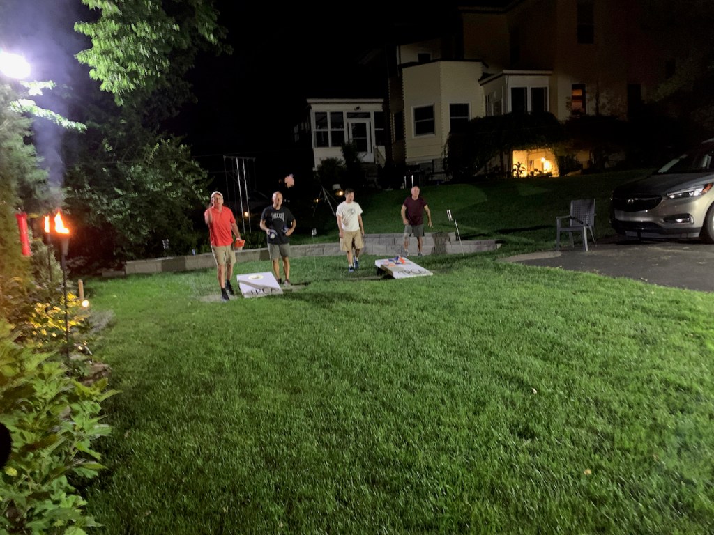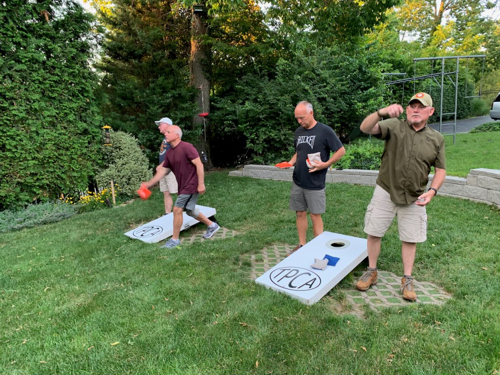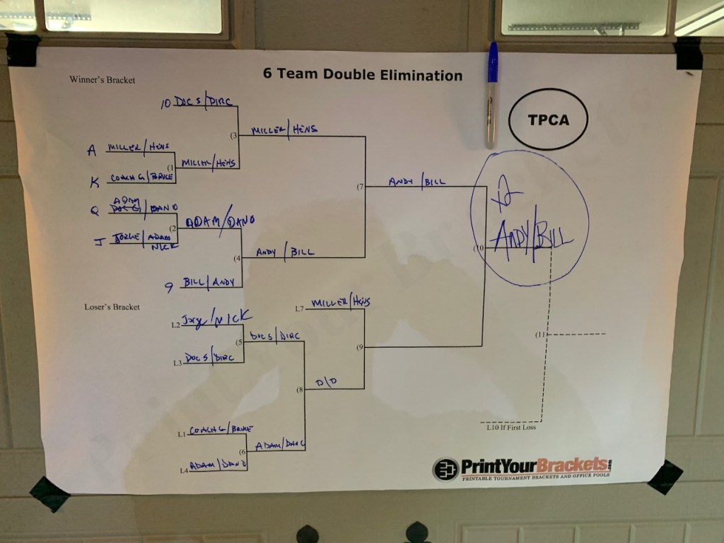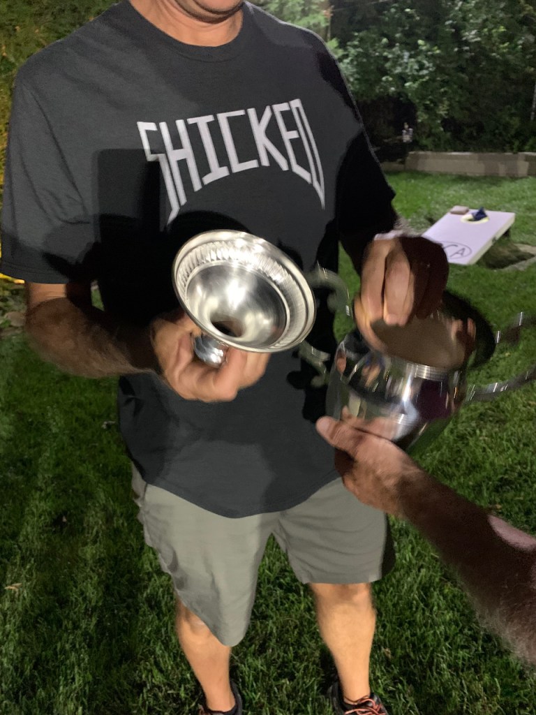 6/17/21 – Perfect summer evening with a very low cicada count. We celebrated our 13 year anniversary with a beer exchange and tournament. We had 6 teams in our standard blind draw, double elimination tournament. The big winners were Bill Keefer and Andy Miller. Congratulations! Andy is a two in a row winner. He just draws the best partners. Now that we are at 13 count for shots is that less likely than 12 ? Is there a statistician in the house ? Also congratulations to Bryan for winning the Highlander. Too bad about your trophy but you earned it for missing cornhole.