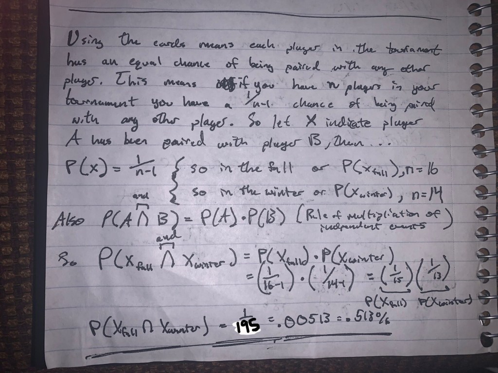 My Solution: The Fall Toss off had 8 teams = 16 players. The chances of George getting Andy were 1 in 15. The Christmas Spectacular had 7 teams = 14 players. The chances of Andy getting George again were 1 in 13. So 1/15 * 1/13 = 0.005128205128205 or 1 in 195.