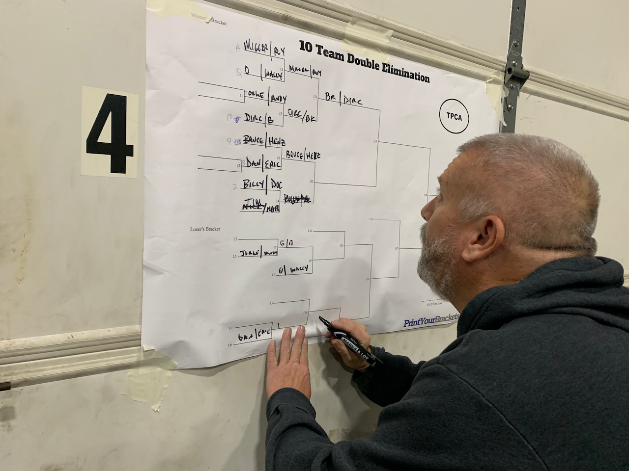 Our 13th annual Christmas Beer Exchange and Cornhole Spectacular was a tournament for the record books. The Fall Toss Off winners, Andy and George, were drawn as partners again. This is a statistically unlikely event (actually 1 in 195; see footnote below for solution. ) and was met with some hard looks and calls for a redraw. But the team of Dirc and Bryan took them out in the first round 21-3. Dirc and Bryan continued their hot streak almost to the end. When it came time to play Bill and Doc S. from the losers bracket they went cold and were Shicked in the first round. In a surprise move they came back in the second round to win the tournament. No team has ever been Shicked and ended up winning a tournament. Is this a Drian or a Birc ?