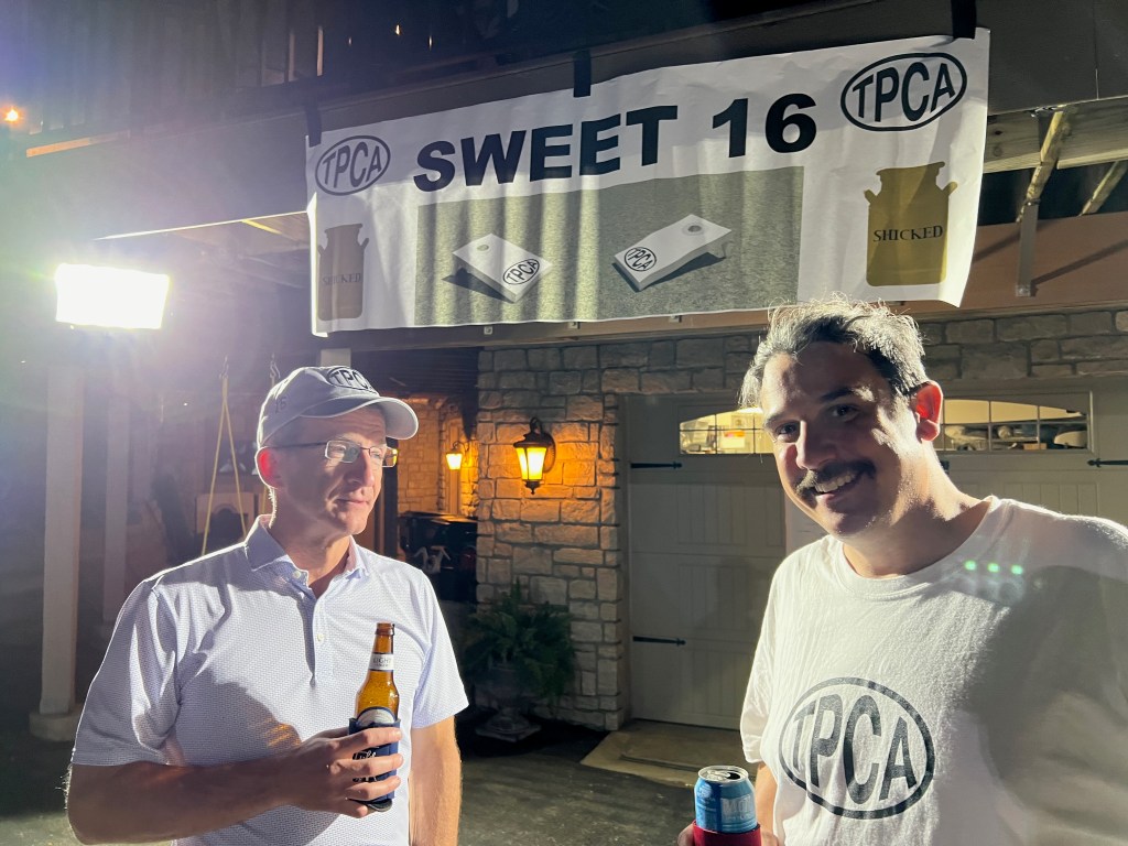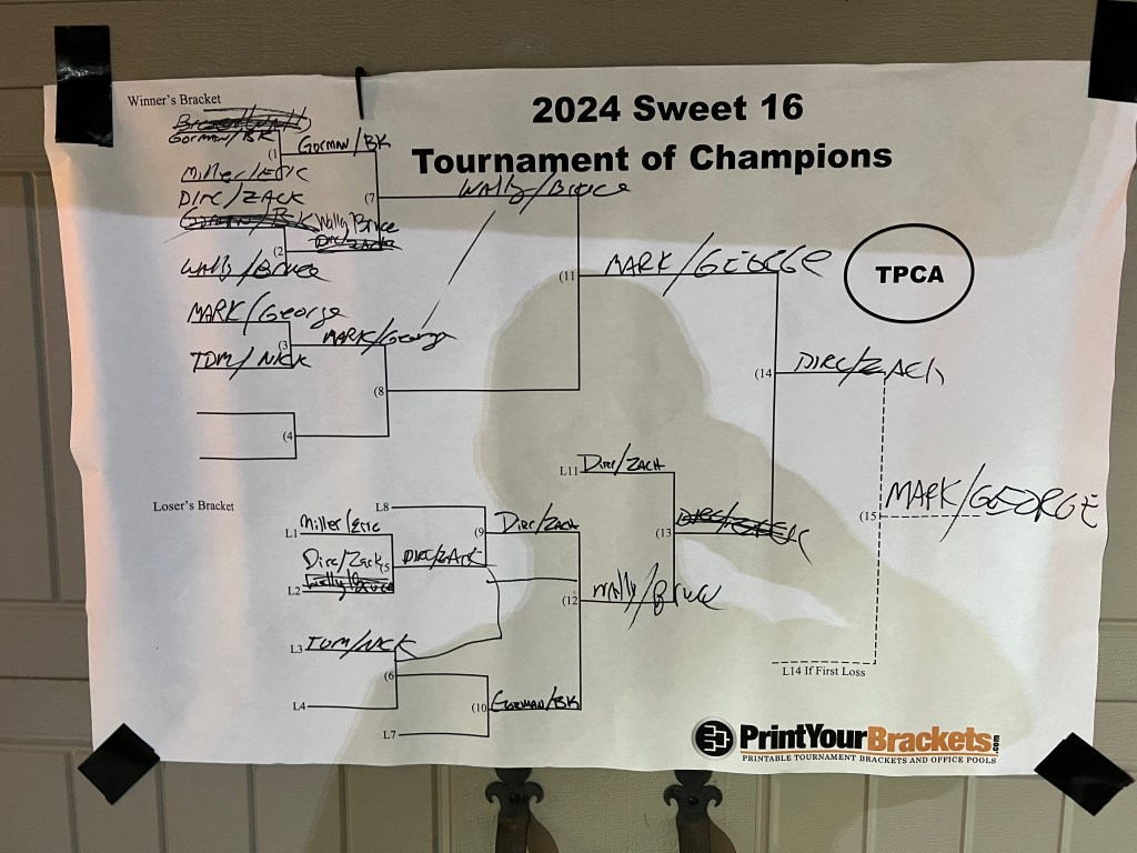 Last night we had our annual Tournament of Champions Sweet 16 competition. Hard to believe we’ve been playing cornhole every Thursday evening for 16 years! We had six teams, a bit light since some people seem to think there are other things to do in life besides play cornhole. I can’t imagine.