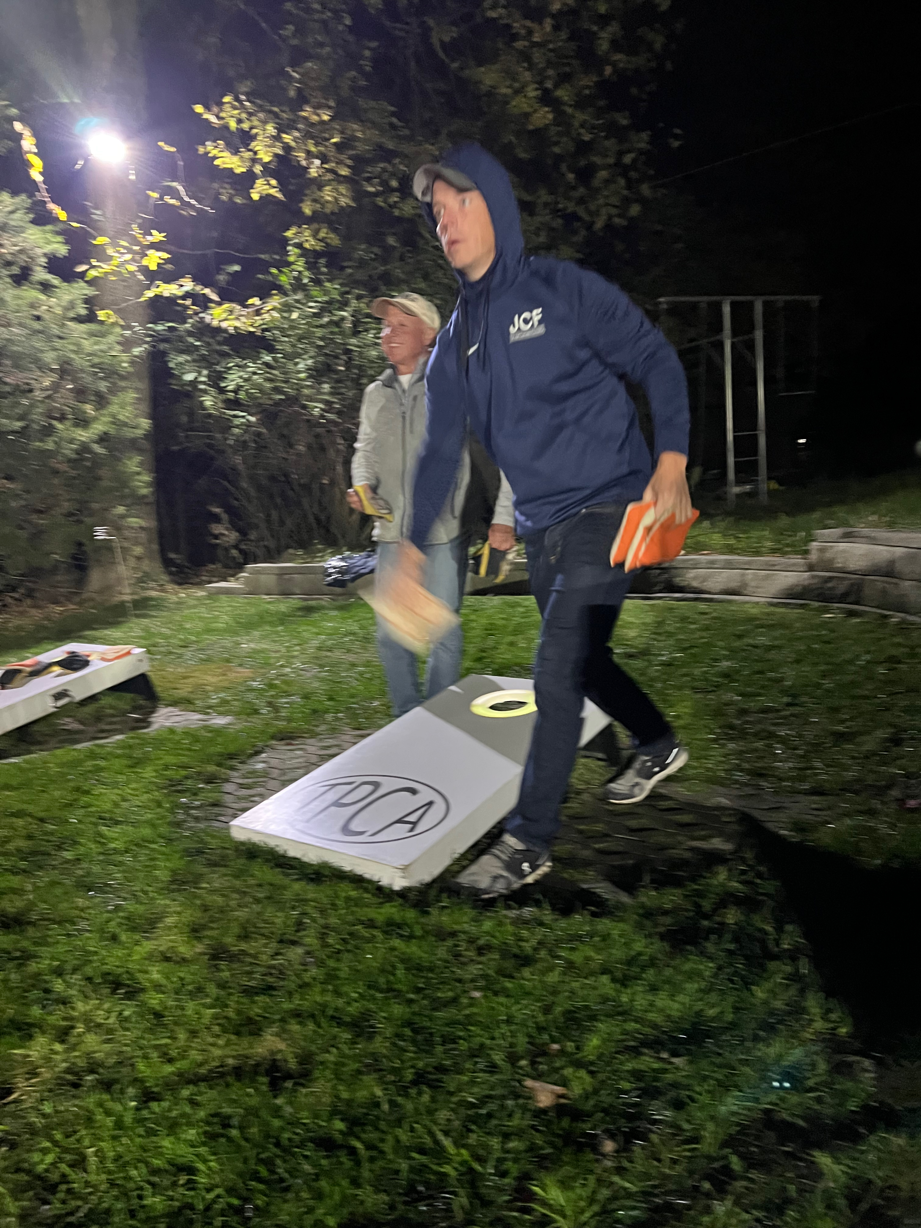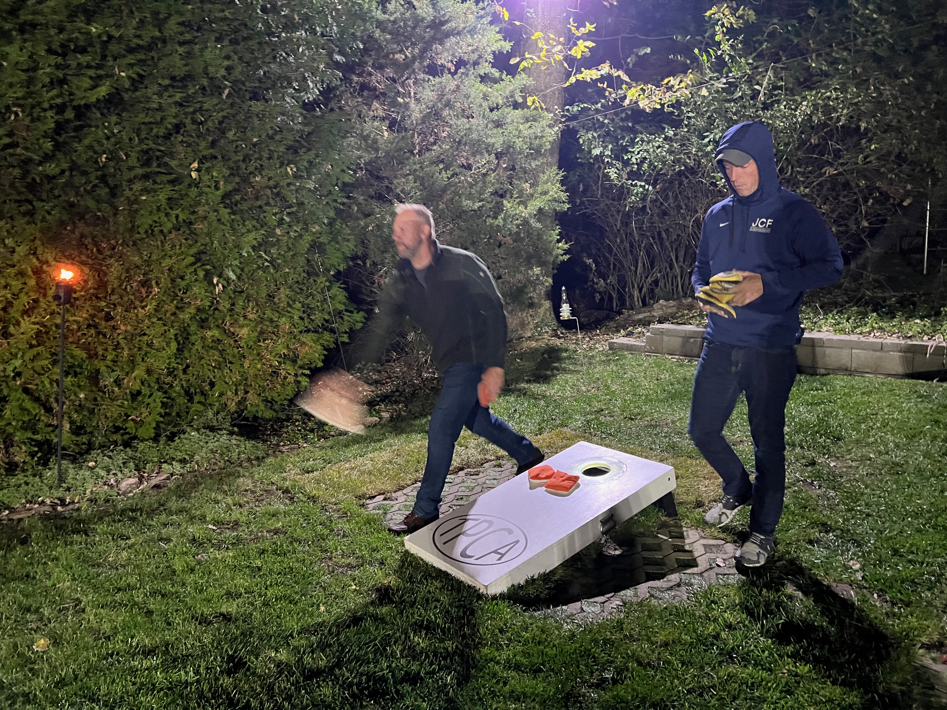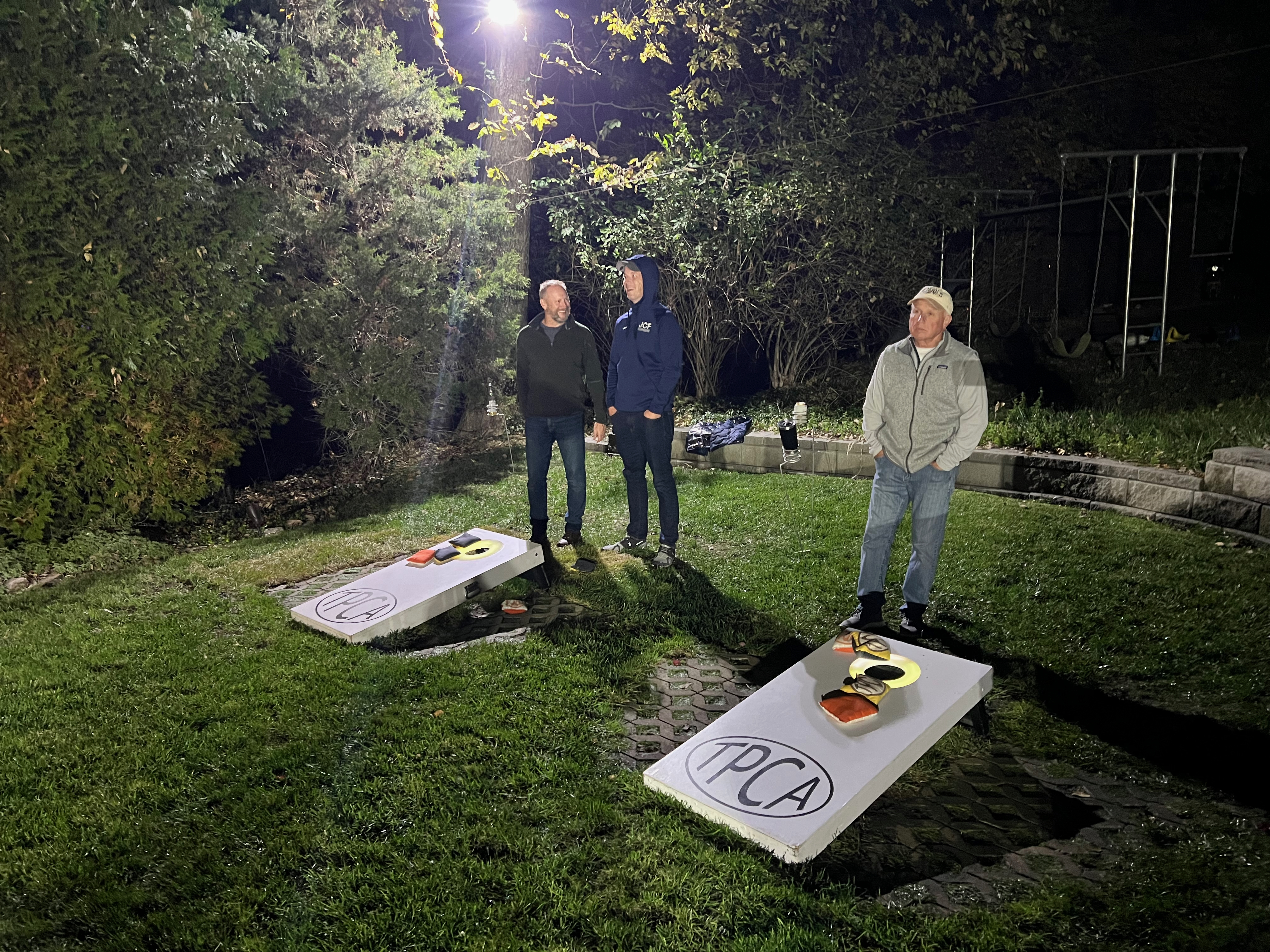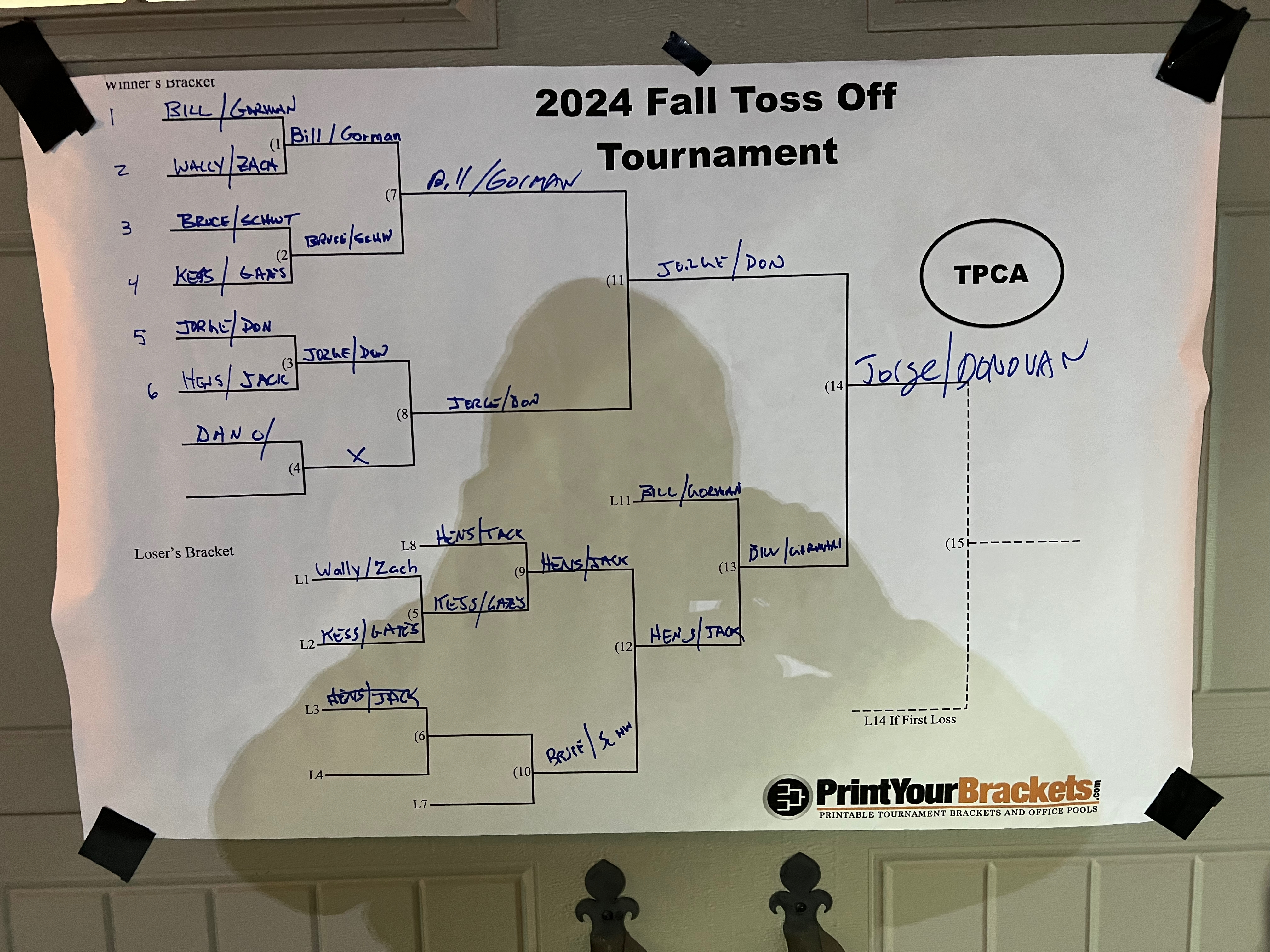 10/24/24 – What an end to a long, dry summer! Last night we had our 16th annual Fall Toss Off tournament of champions. The weather was perfect for some fall cornhole. We had six very competitive teams that were pretty well balanced. Every team had a shot to win the tournament. Even those that don’t play regularly, but have the audacity to show up for tournaments thought they could win. The Donovan/George team prevaled by not losing a single game. Looks like George has won the last three tournaments. Three peat! Is a four peat possible?