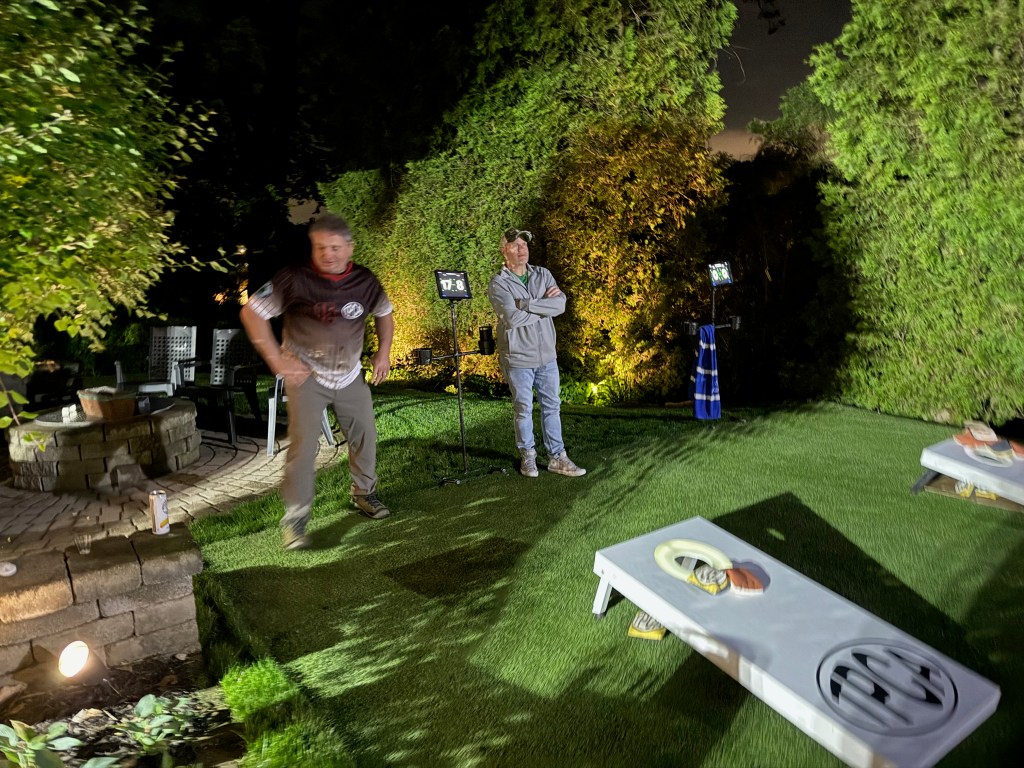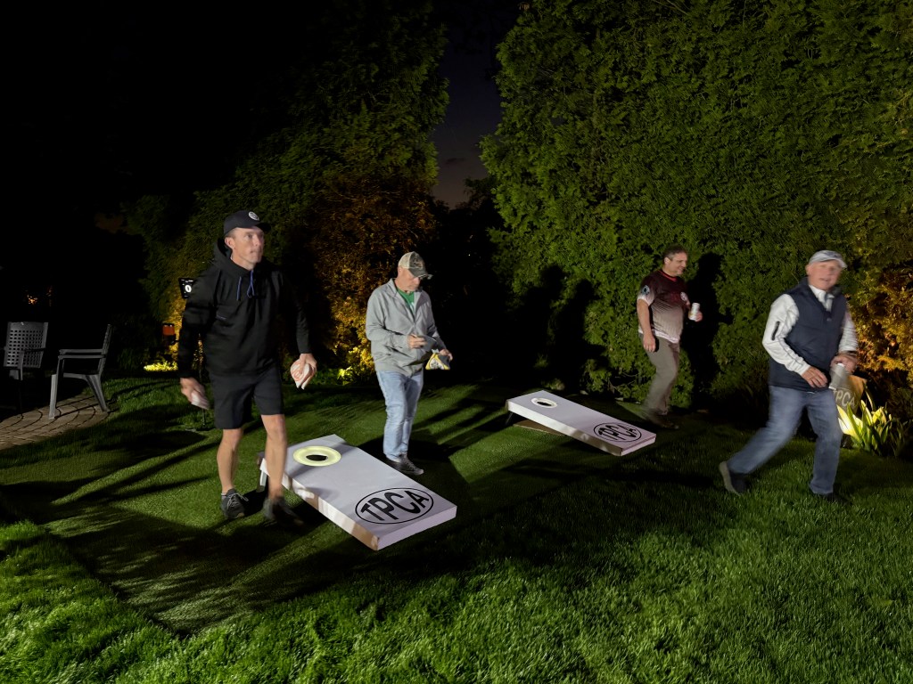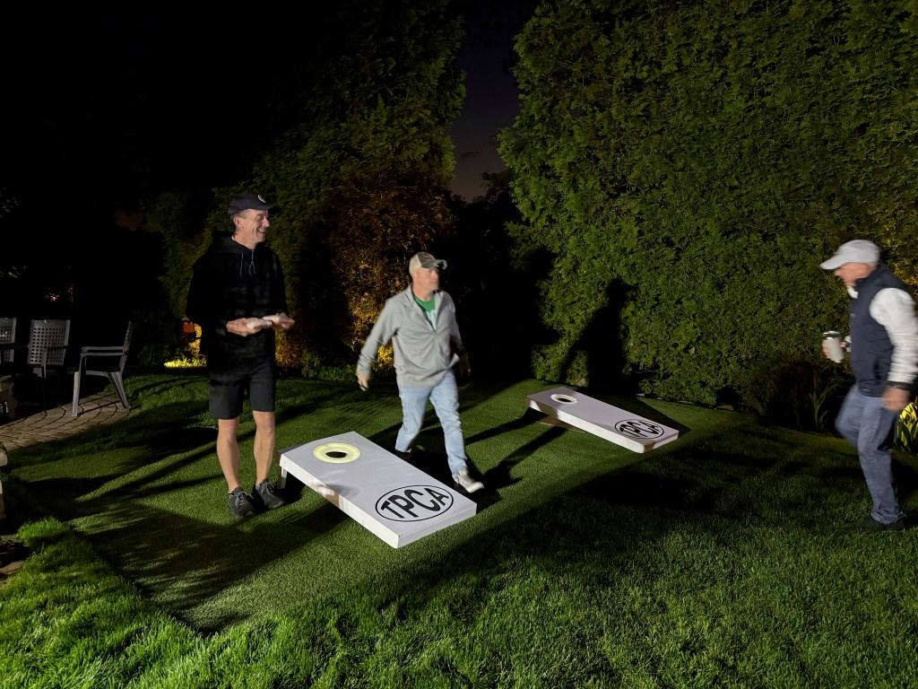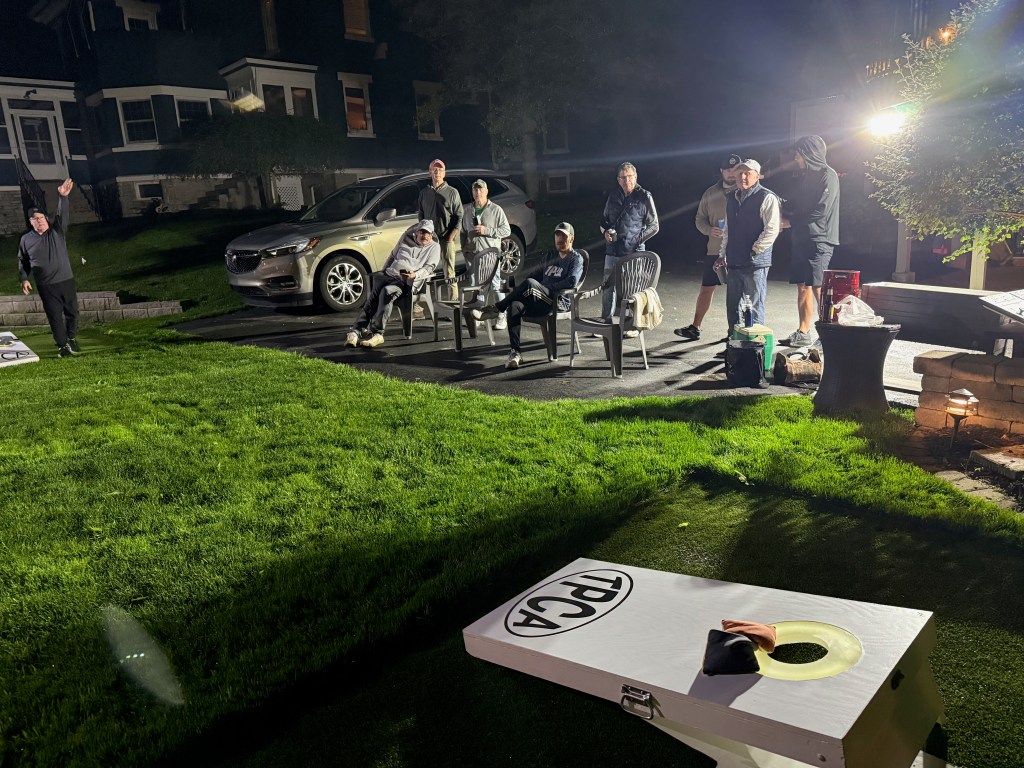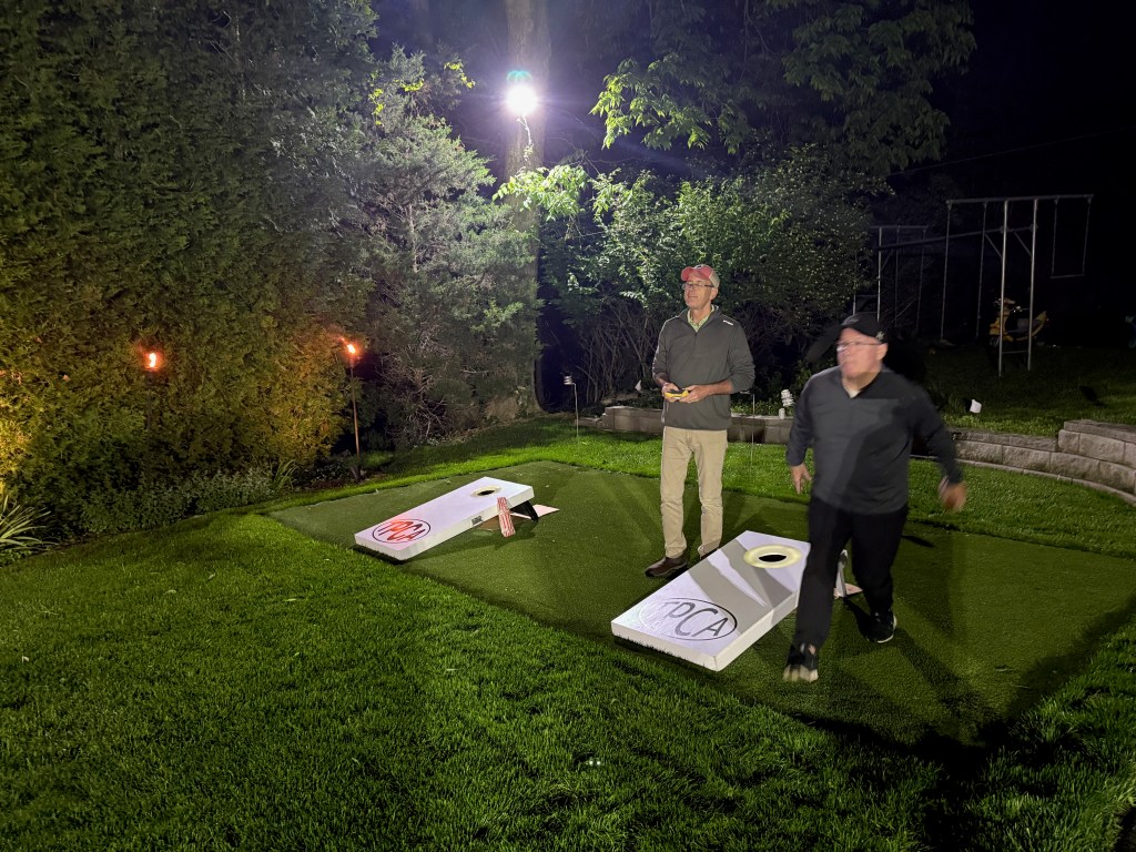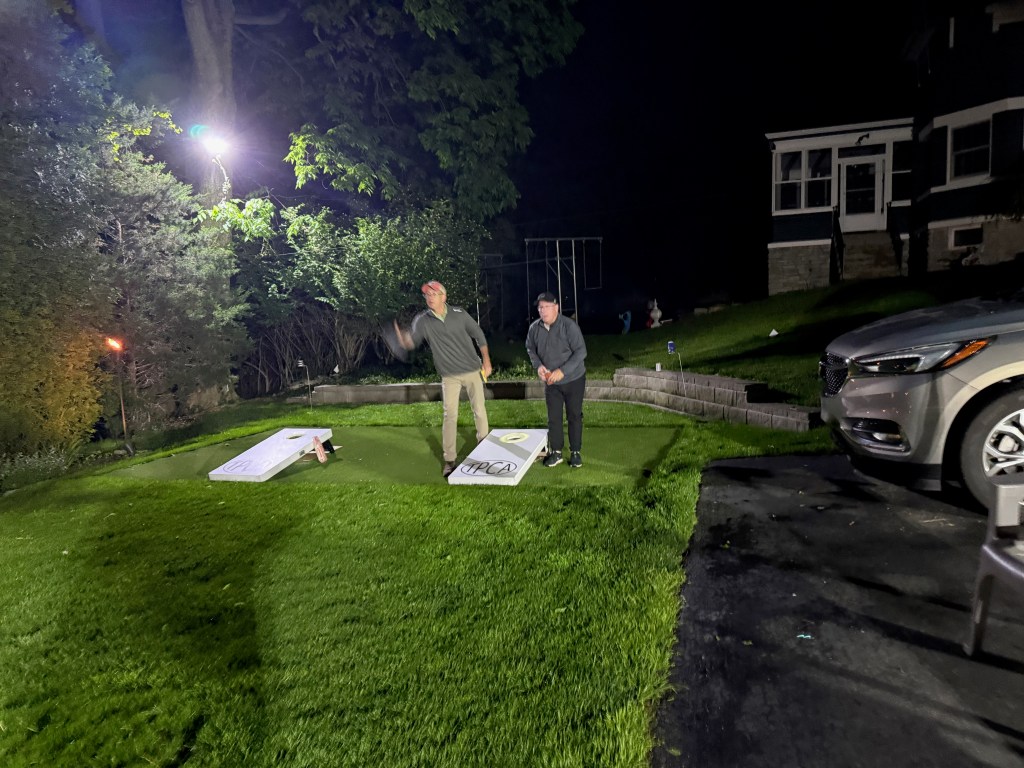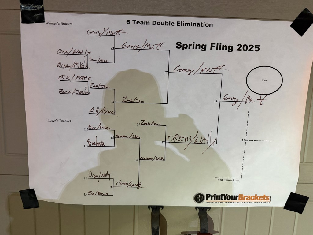 5/6/2025 – What a lousy spring. Way too much rain with lower than normal temperatures. But we had to make a go of it regardless. The forecast originally called for the rain to stop in the late afternoon or early evening but it just kept coming. Finally, about 8:30 pm it stopped and we were able to wipe everything down and start the tournament. The new artificial turf was awesome because it drains well and does not hold water, so the bags stayed much drier and the playability was still good. That turf is a game changer.