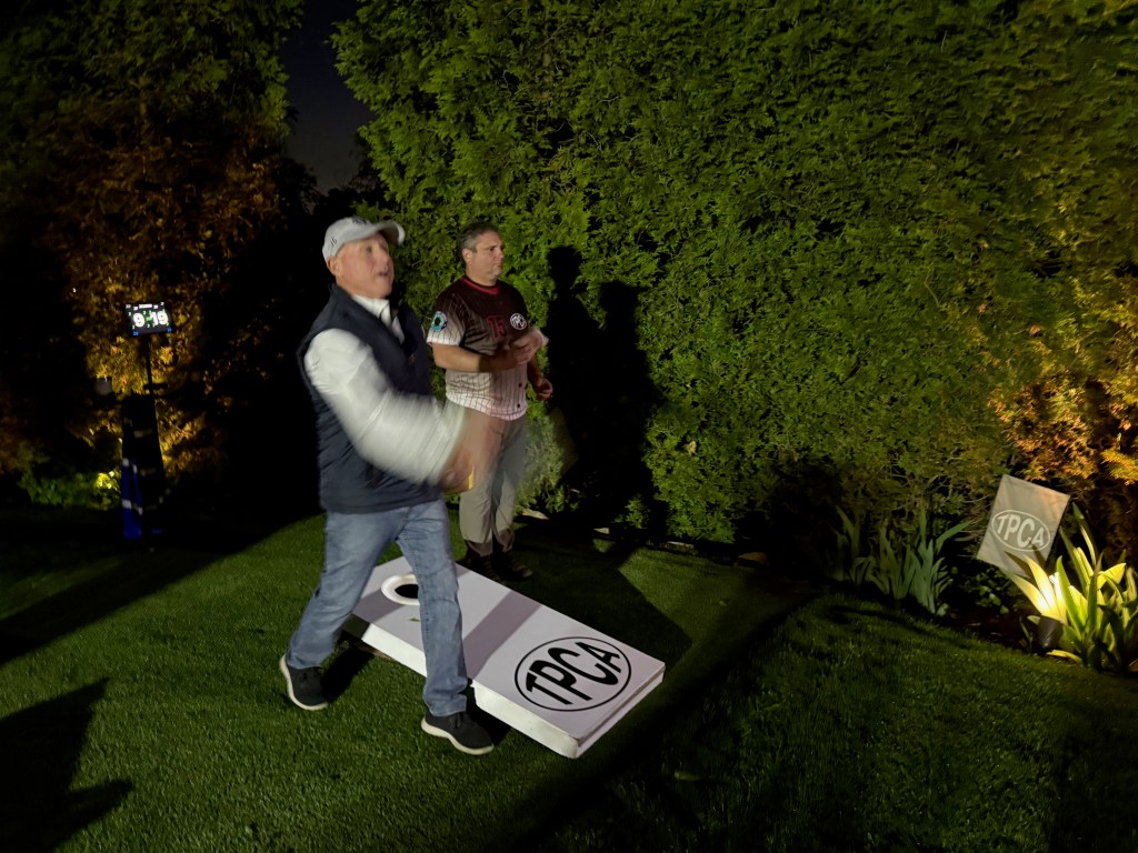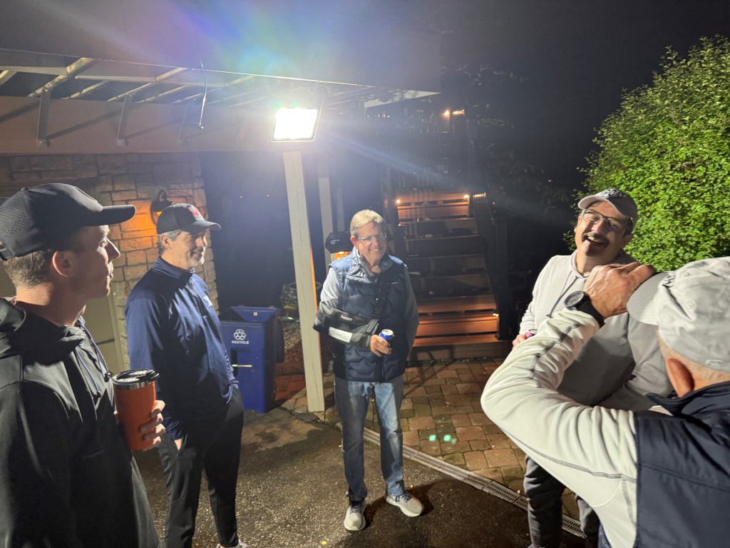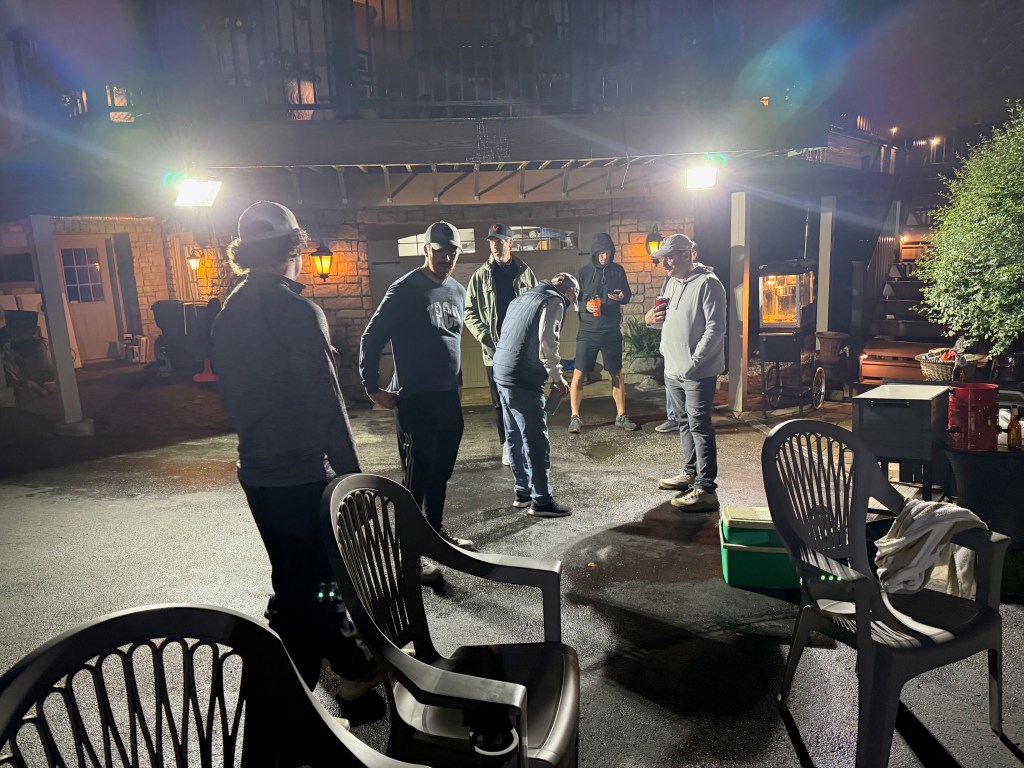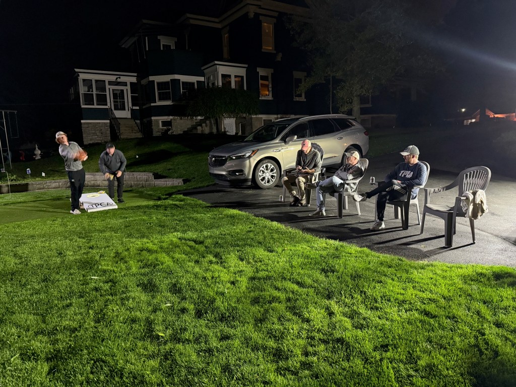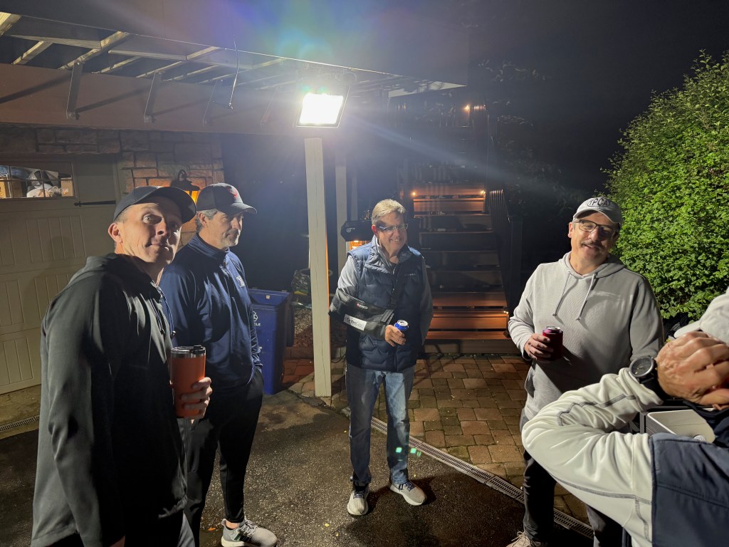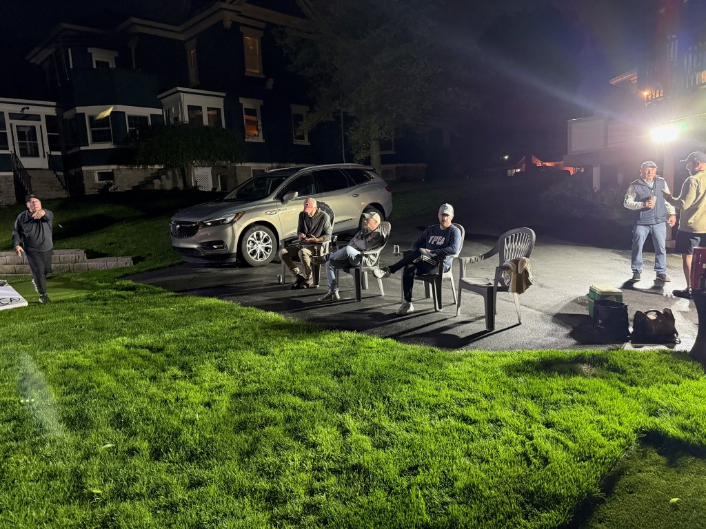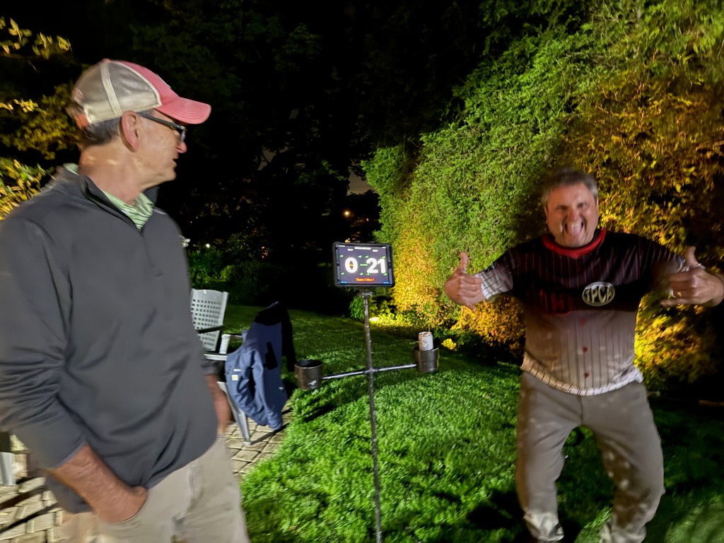 5/6/2025 – What a lousy spring. Way too much rain with lower than normal temperatures. But we had to make a go of it regardless. The forecast originally called for the rain to stop in the late afternoon or early evening but it just kept coming. Finally, about 8:30 pm it stopped and we were able to wipe everything down and start the tournament. The new artificial turf was awesome because it drains well and does not hold water, so the bags stayed much drier and the playability was still good. That turf is a game changer.