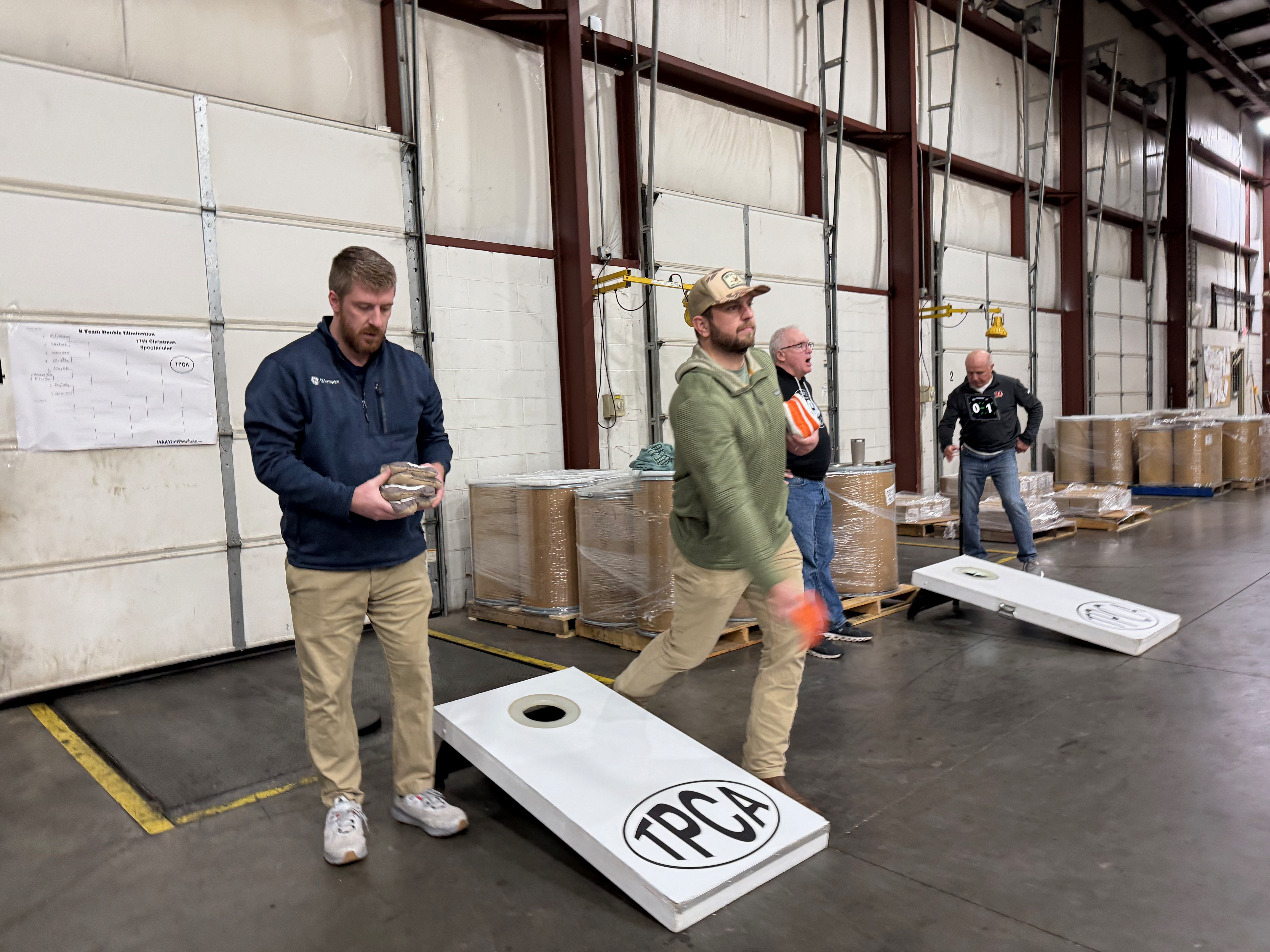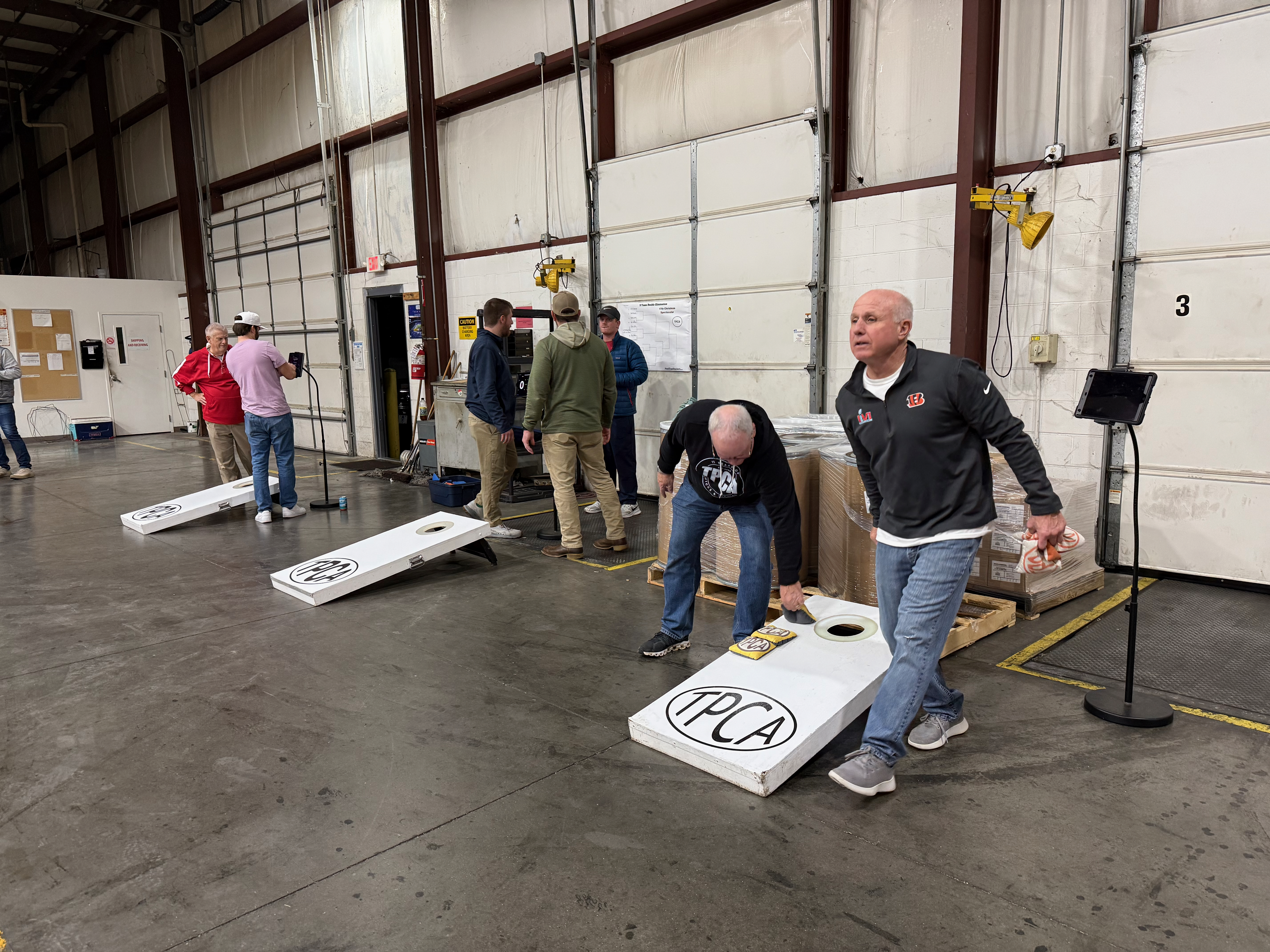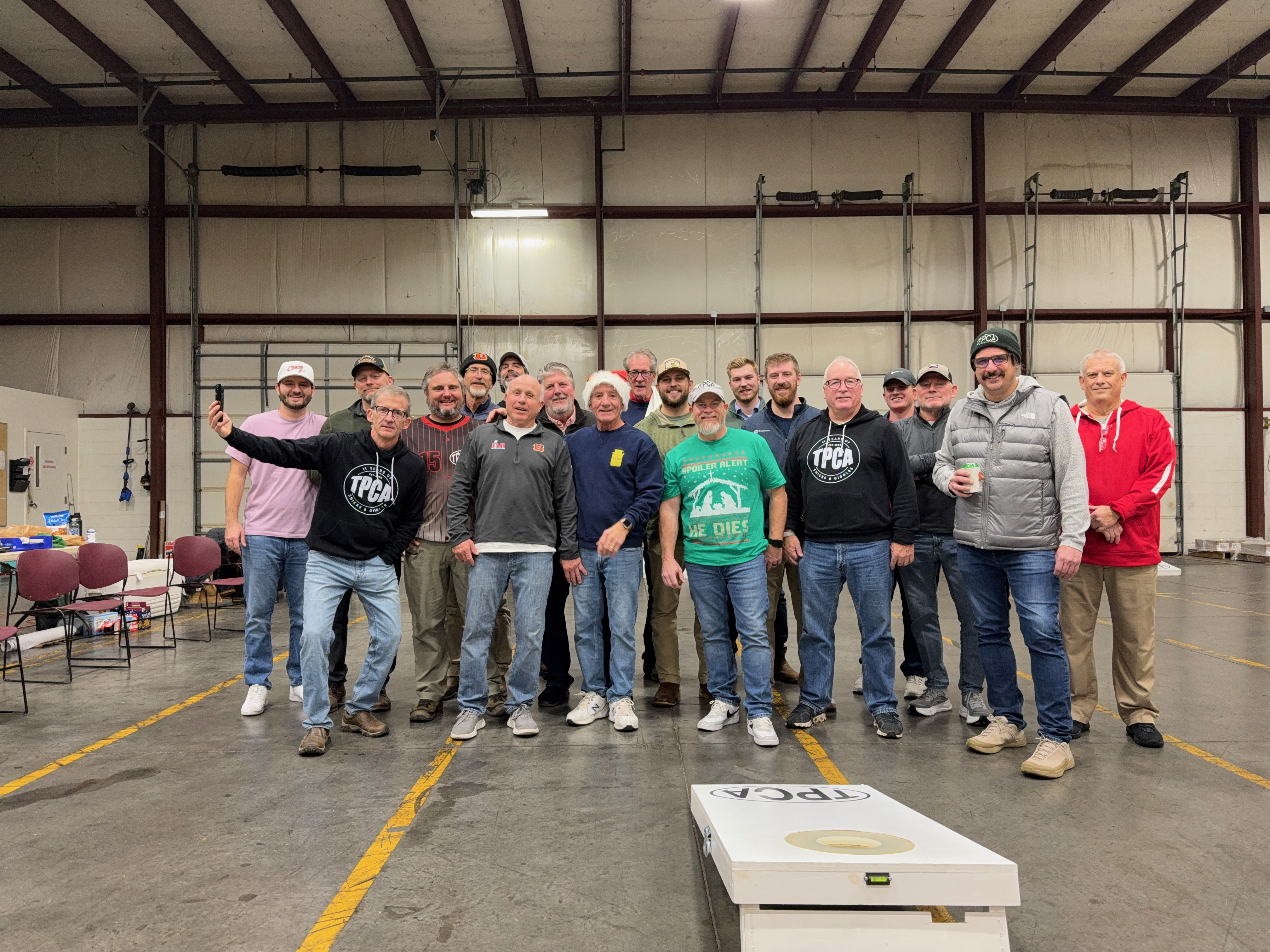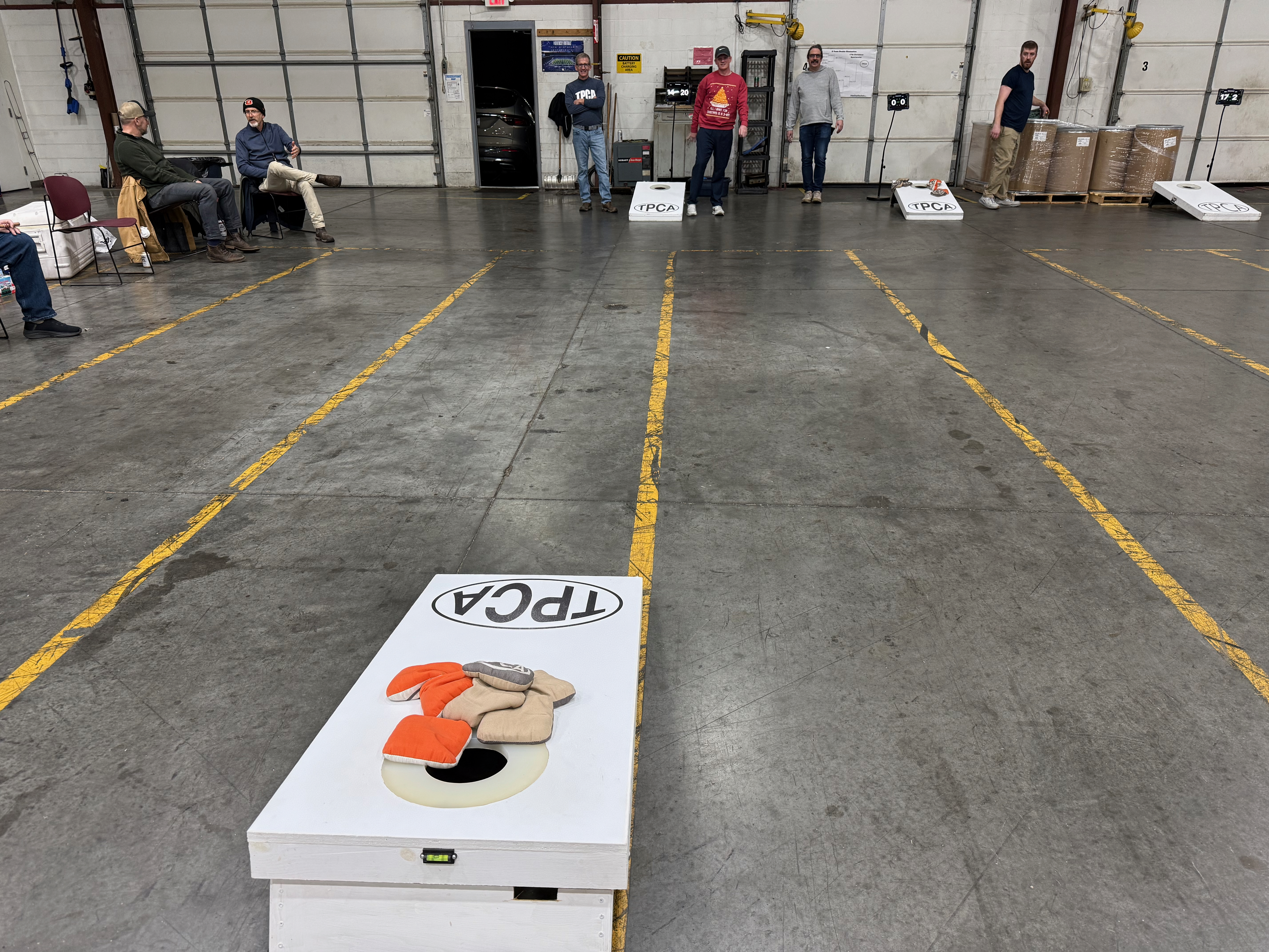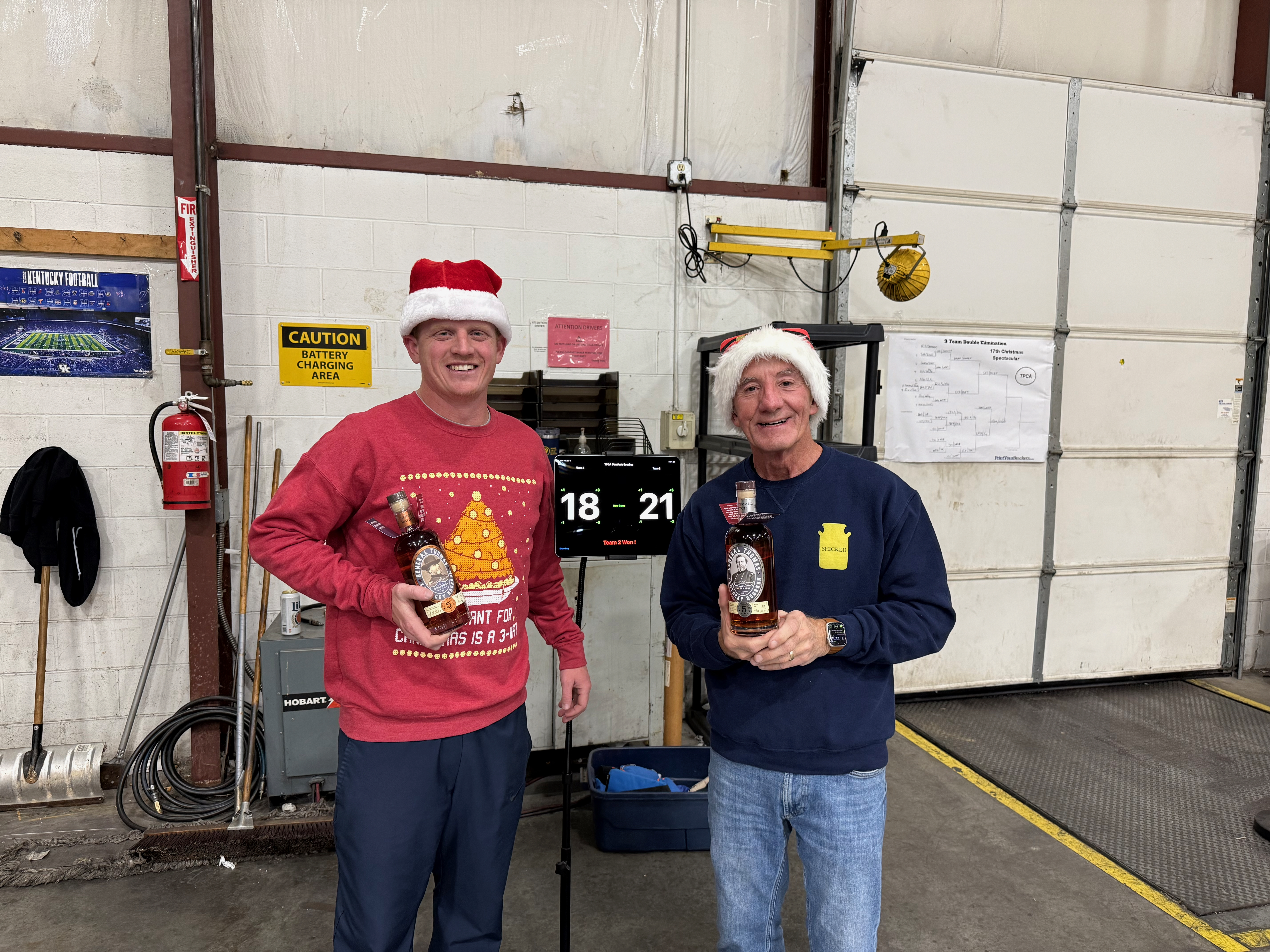 12/18/2025 – We had our annual Christmas Beer Exchange and Cornhole Spectacular tournament at John’s building in Wilder. We had lots of appetizers and beer! There were nine teams in our usual blind draw, double-elimination tournament. The dream team of Muff and George won, but it wasn’t easy; a couple of the games were way too close. Muff’s new haircut must have helped him play so well. It was nice to see the occasional players there. The prizes were General Thomas Bourbon with a special Christmas message. Fun times for all! Merry Christmas.
