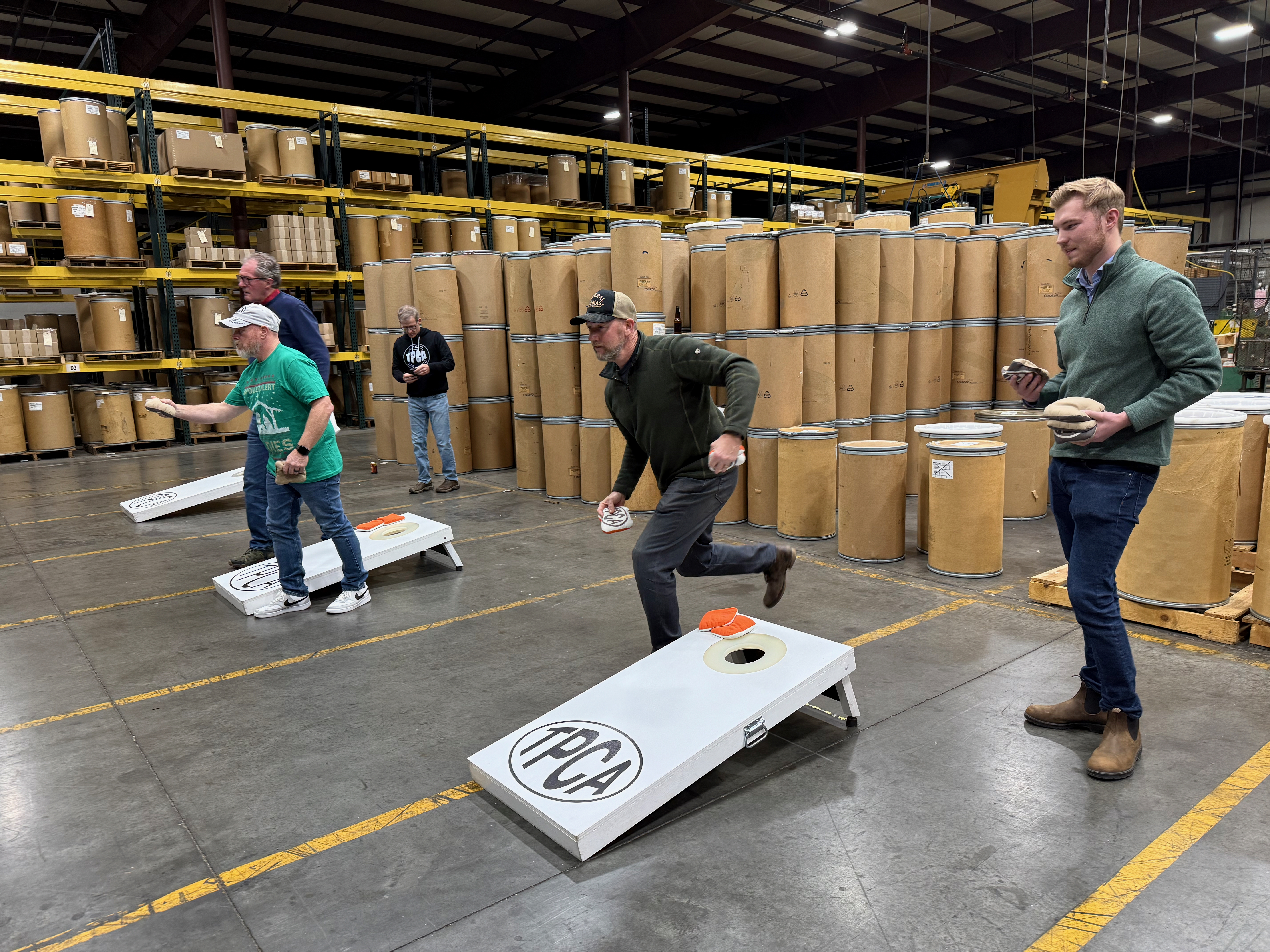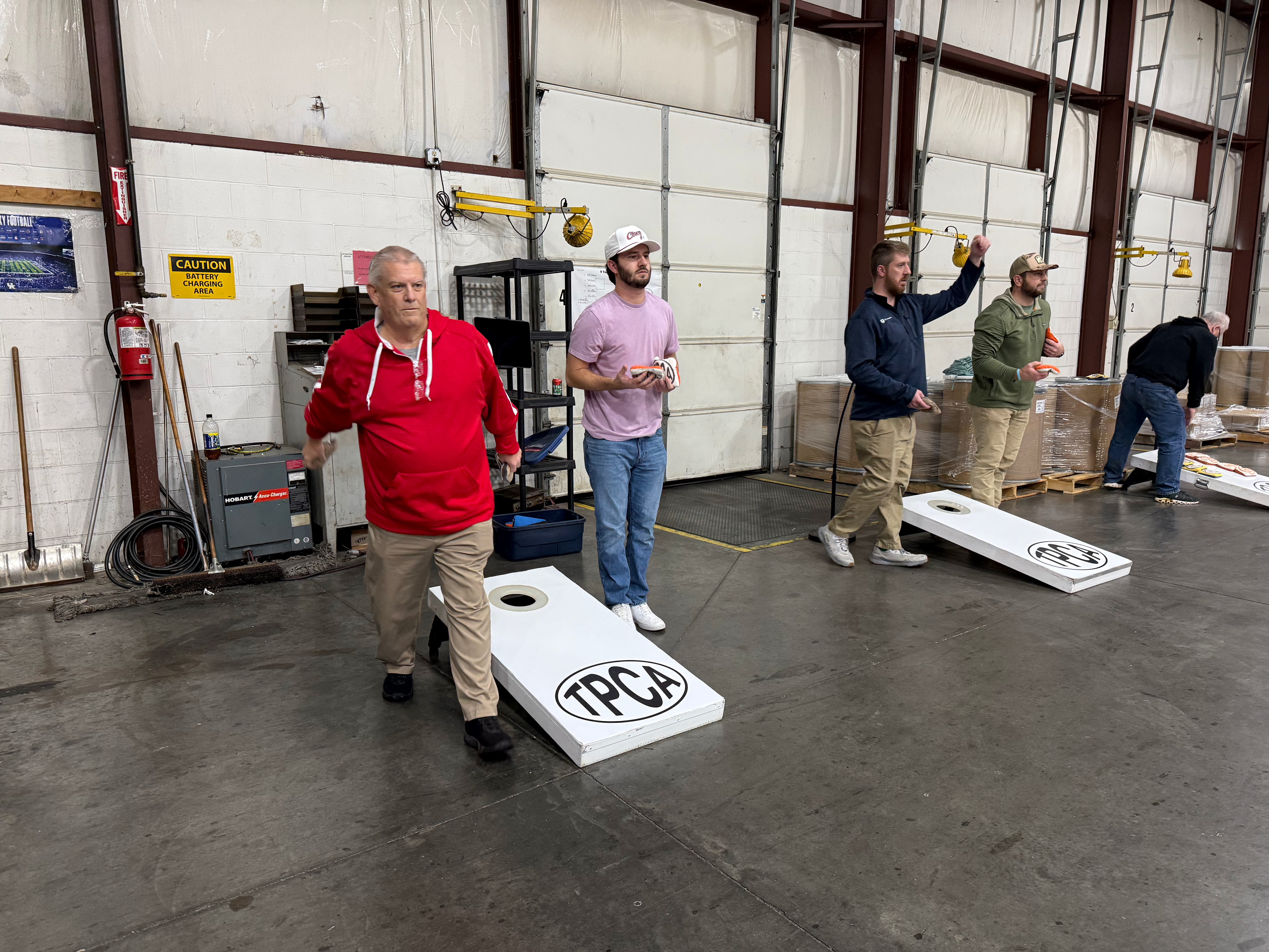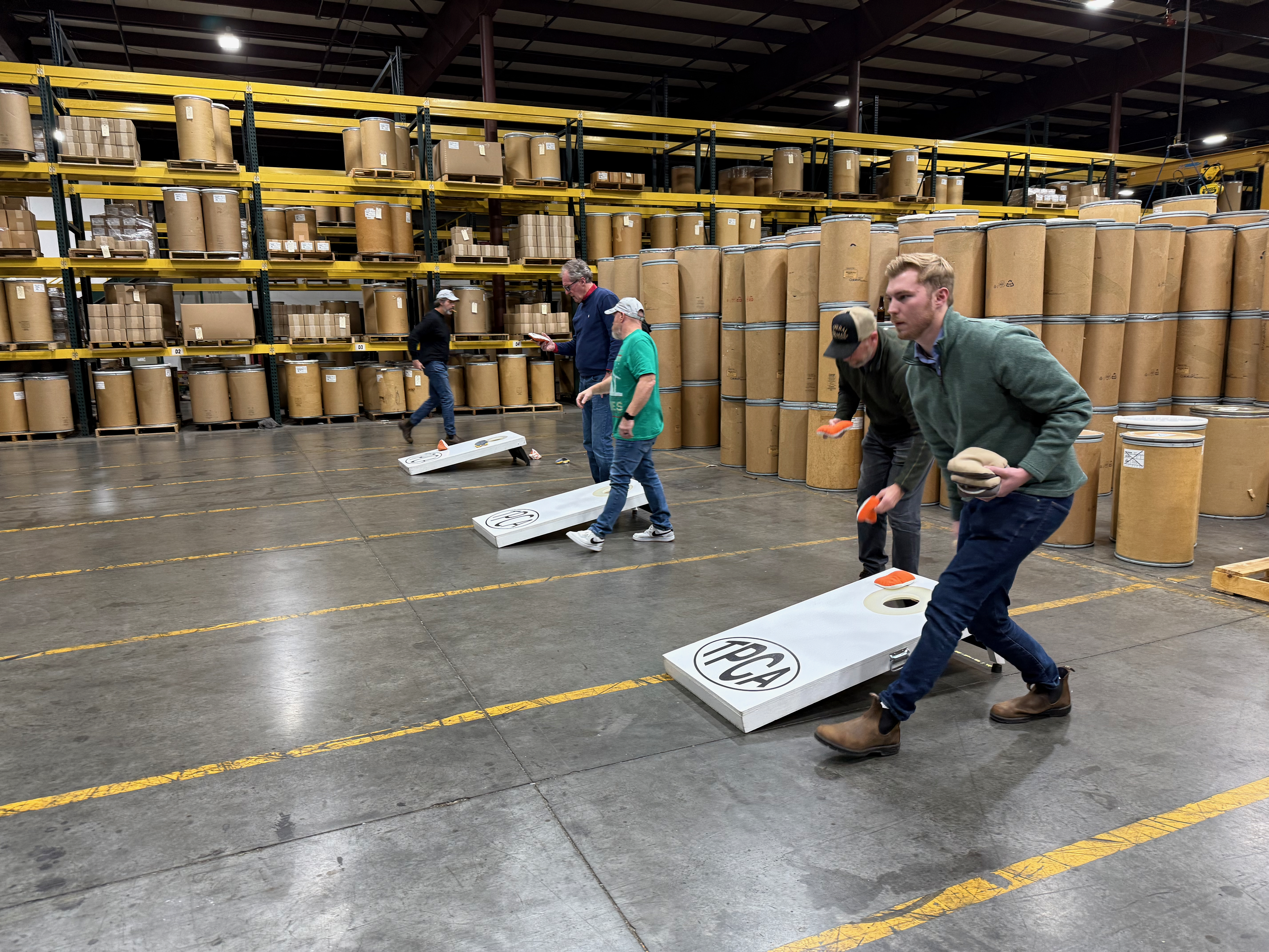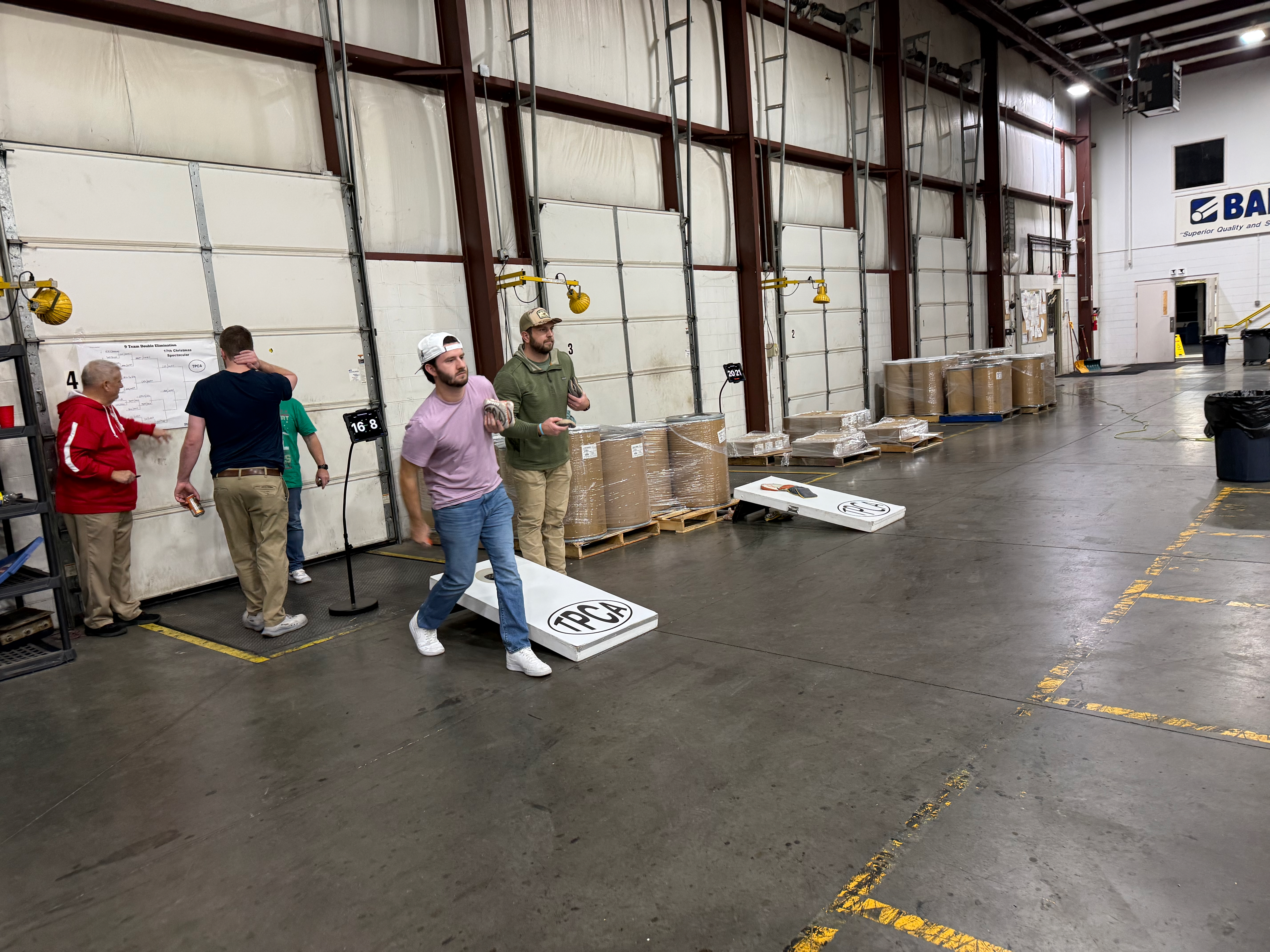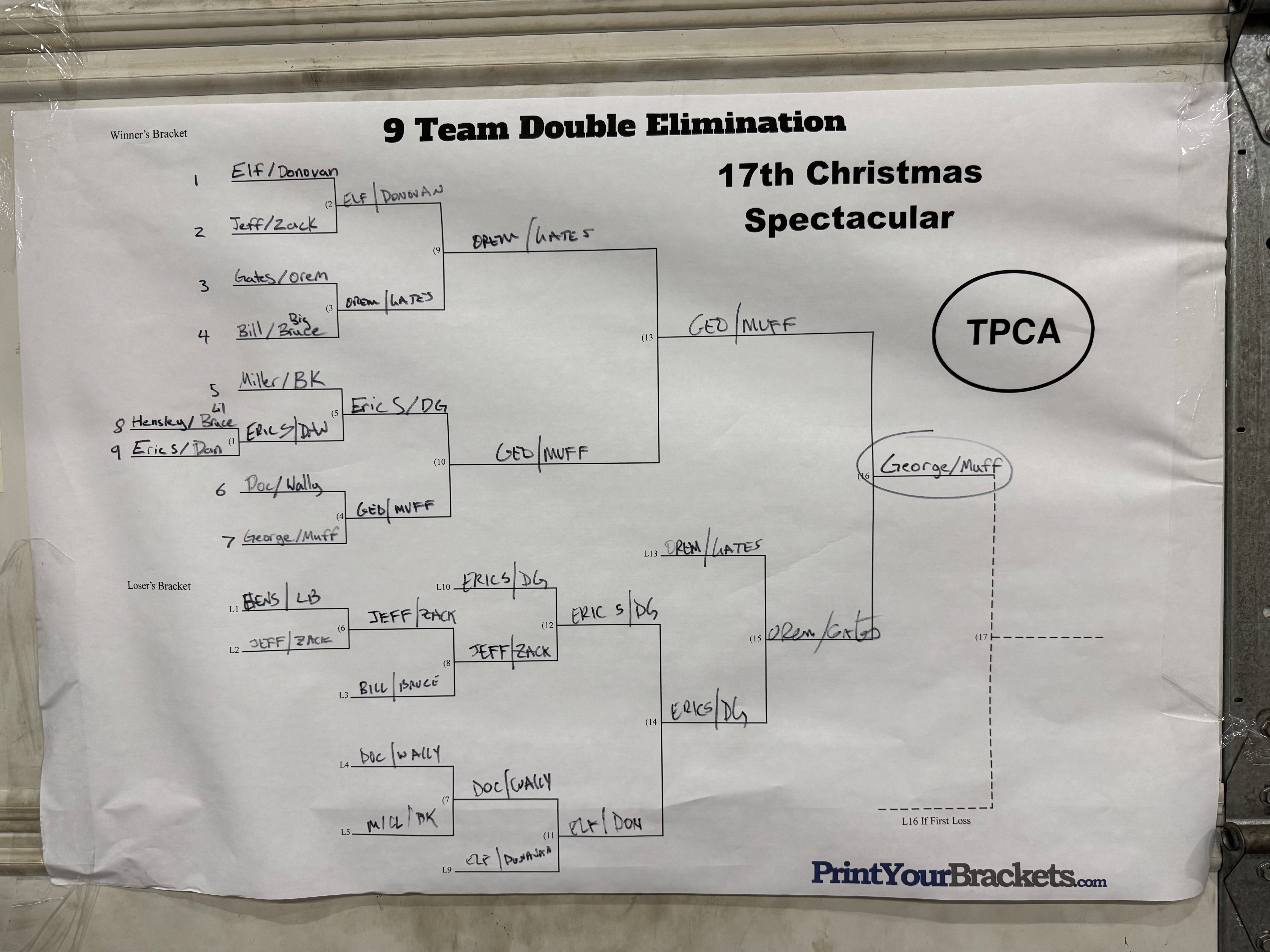 12/18/2025 – We had our annual Christmas Beer Exchange and Cornhole Spectacular tournament at John’s building in Wilder. We had lots of appetizers and beer! There were nine teams in our usual blind draw, double-elimination tournament. The dream team of Muff and George won, but it wasn’t easy; a couple of the games were way too close. Muff’s new haircut must have helped him play so well. It was nice to see the occasional players there. The prizes were General Thomas Bourbon with a special Christmas message. Fun times for all! Merry Christmas.