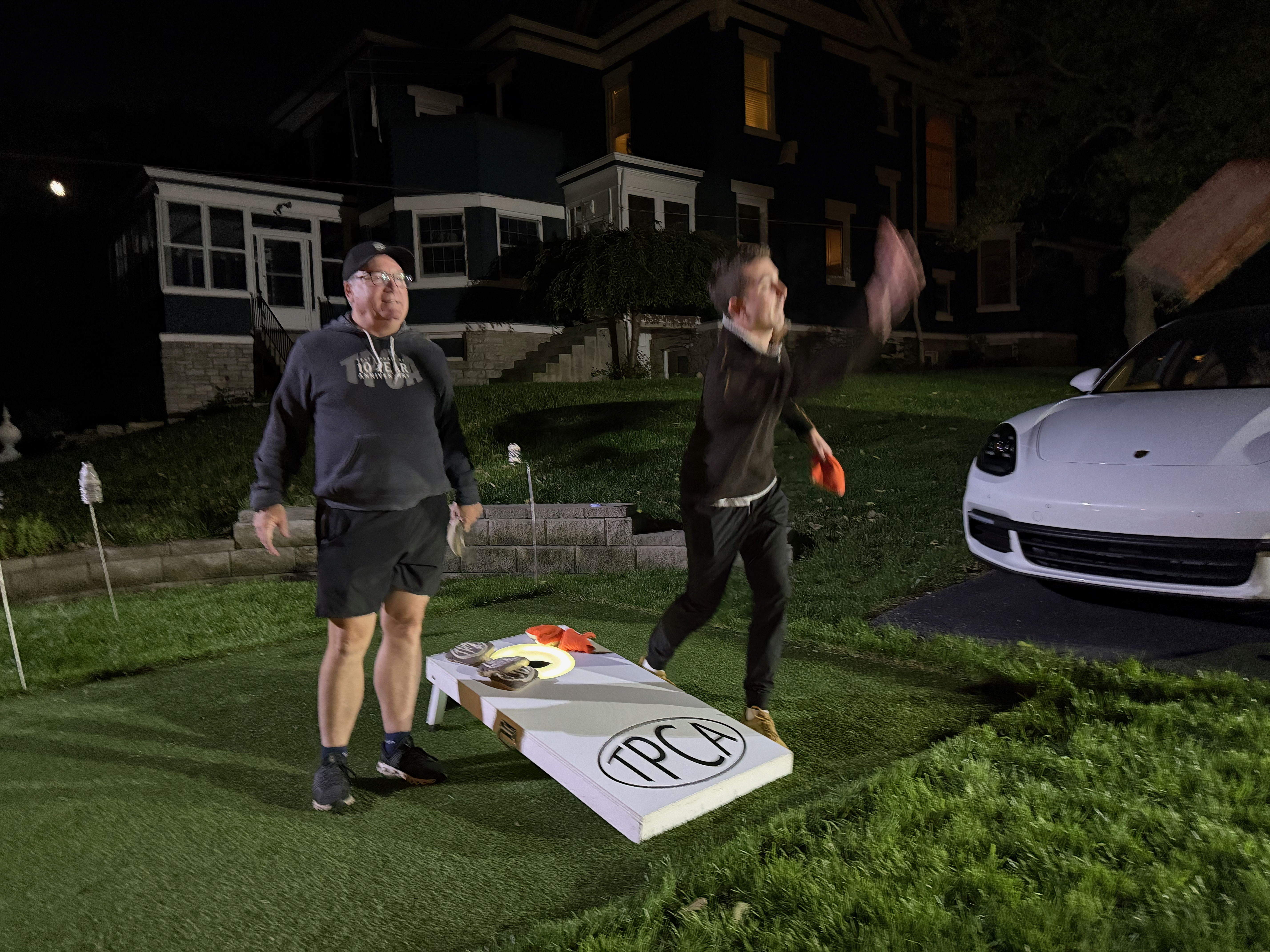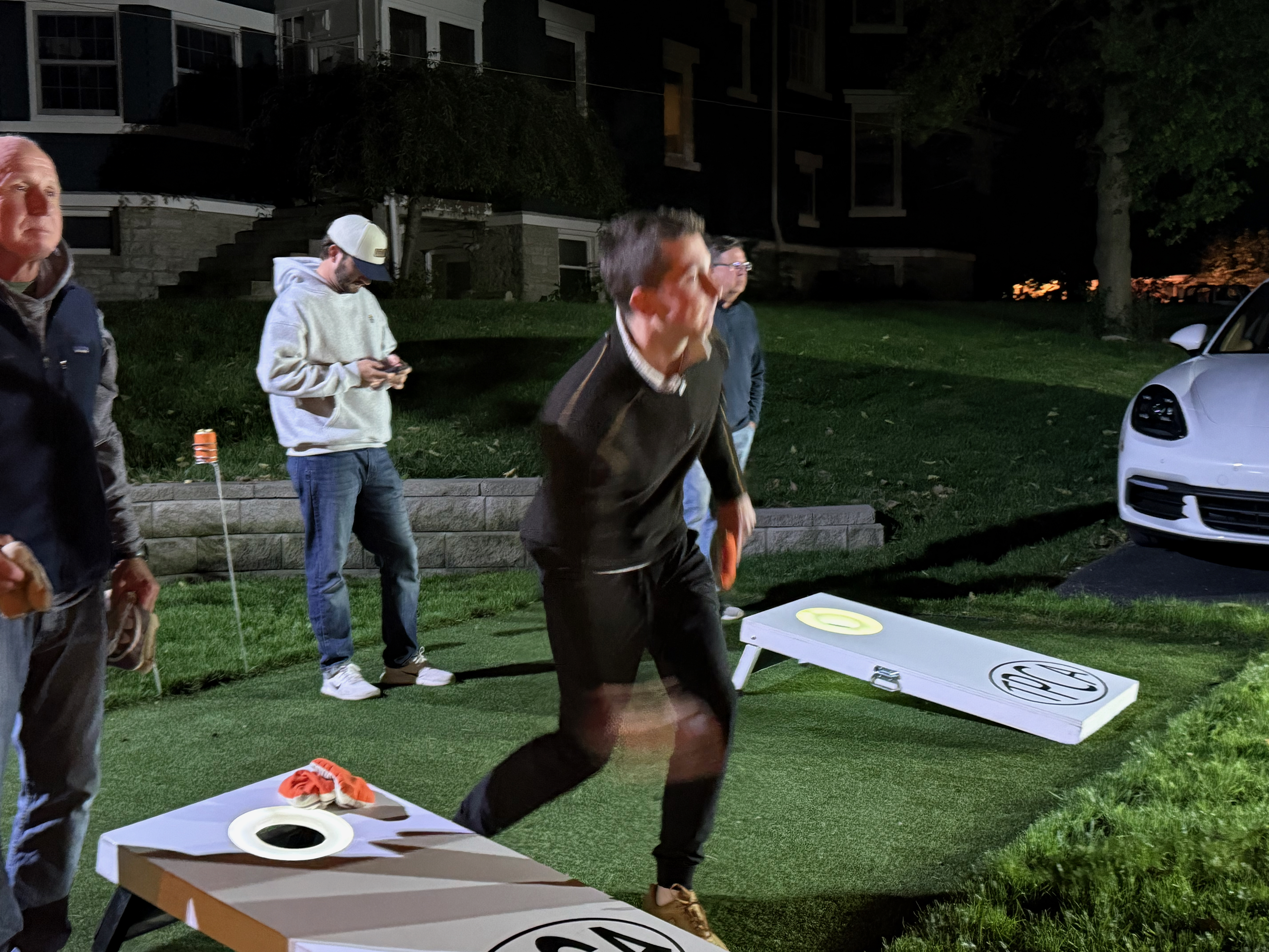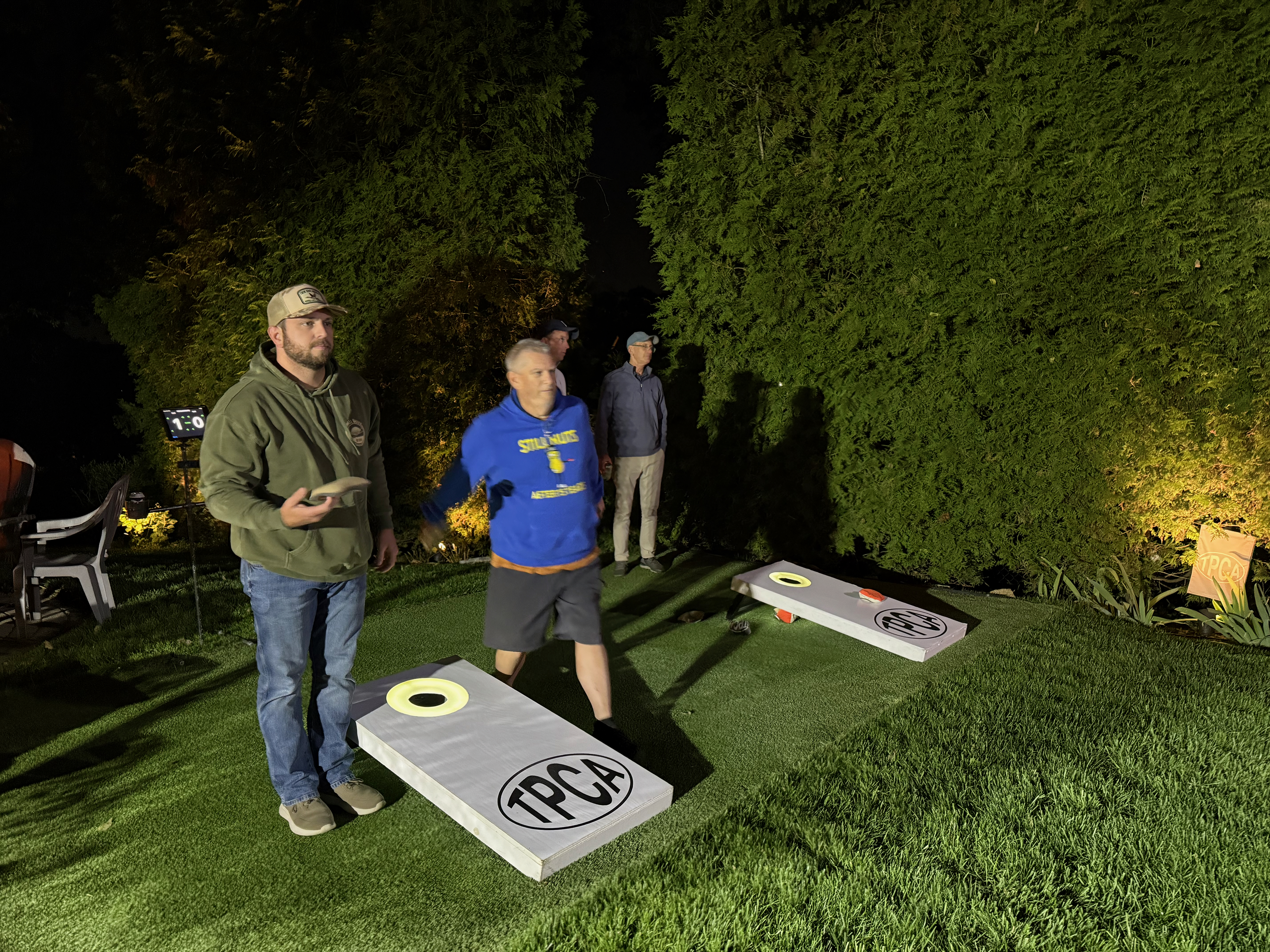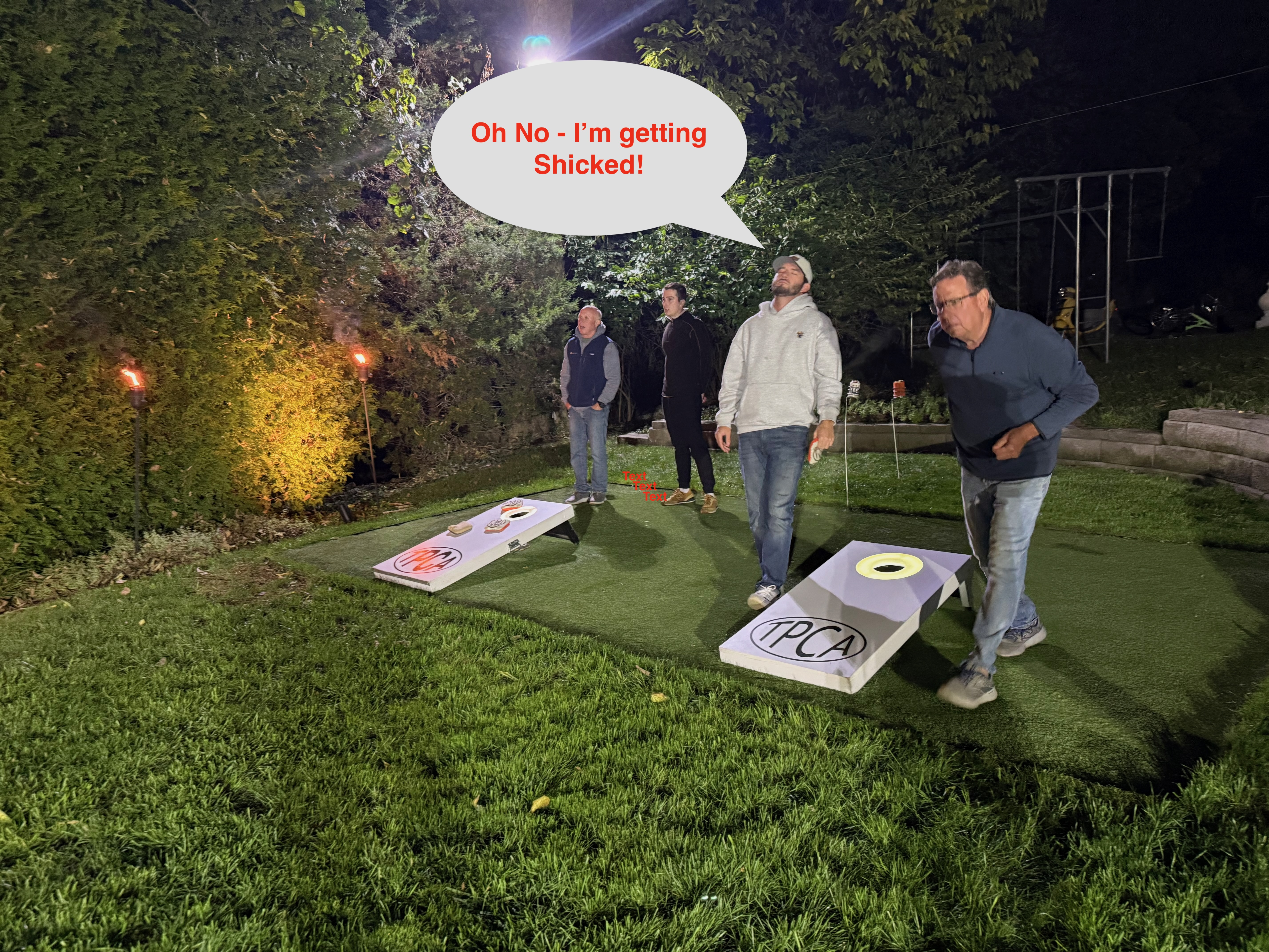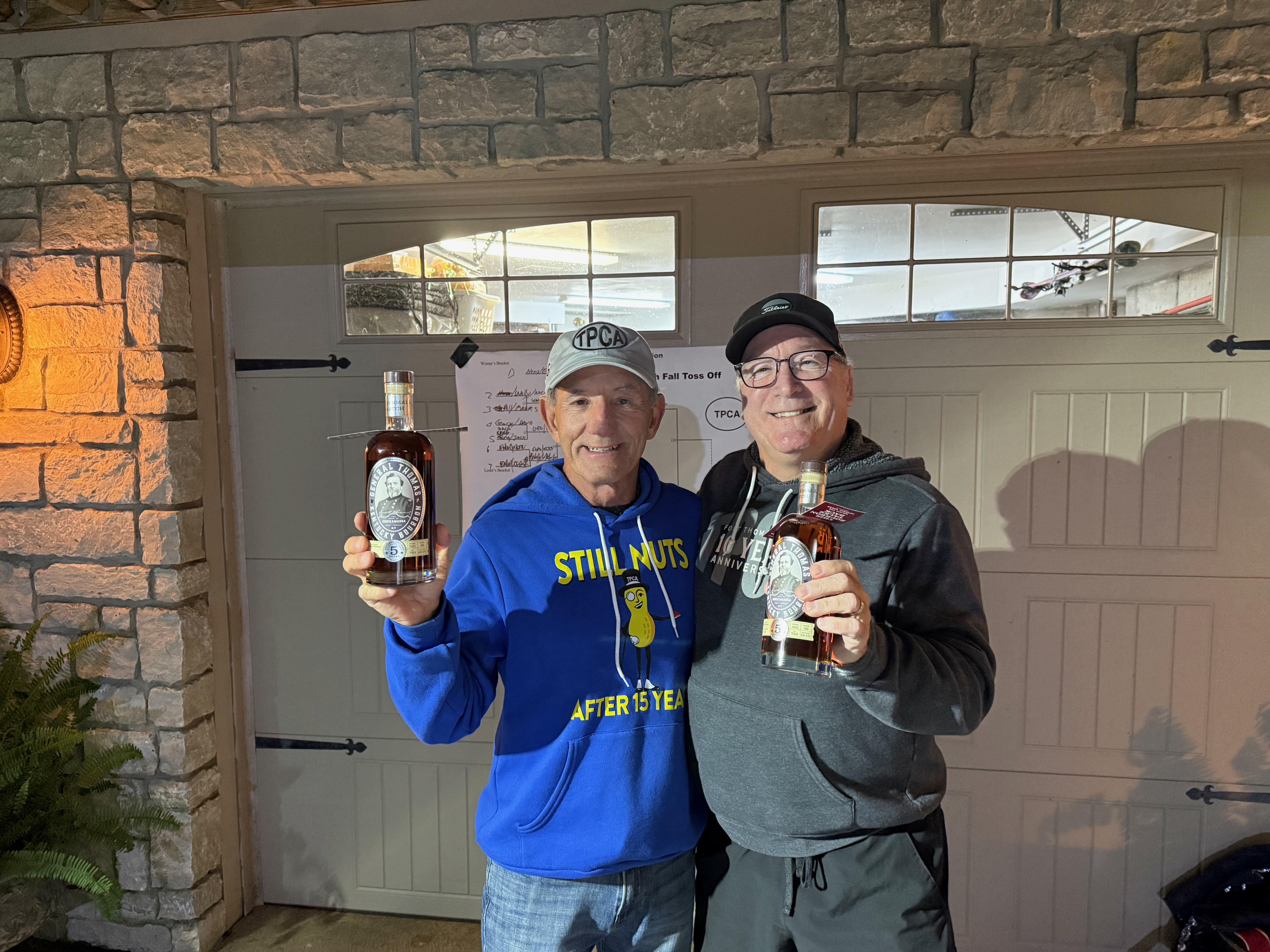 12/18/2025 – We had our annual Christmas Beer Exchange and Cornhole Spectacular tournament at John’s building in Wilder. We had lots of appetizers and beer! There were nine teams in our usual blind draw, double-elimination tournament. The dream team of Muff and George won, but it wasn’t easy; a couple of the games were way too close. Muff’s new haircut must have helped him play so well. It was nice to see the occasional players there. The prizes were General Thomas Bourbon with a special Christmas message. Fun times for all! Merry Christmas.